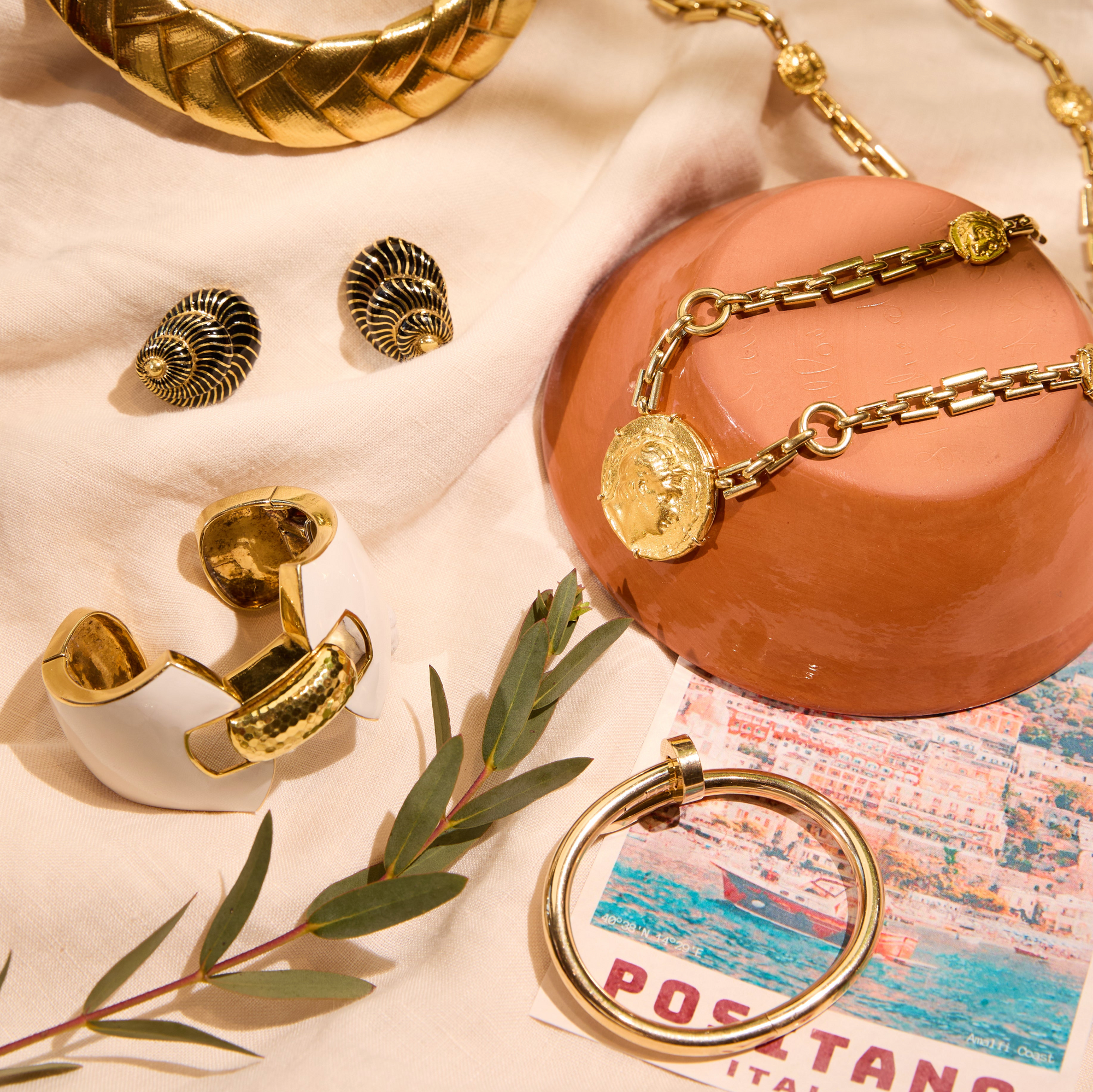 This winter, escape the cold in gold. The Holiday Treasures collection pairs vintage gold-on-gold, turquoise, and timepieces with the ease of resort wear, swimsuits, and sunlit days away.