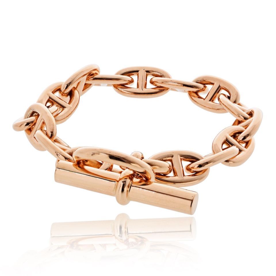 A bold and luxurious Hermès bracelet crafted in radiant 18K rose gold, featuring the coveted medium link design with a sleek, high-polished finish. This piece has incredible presence on the wrist # substantial, refined, and timeless in true Hermès fashion.