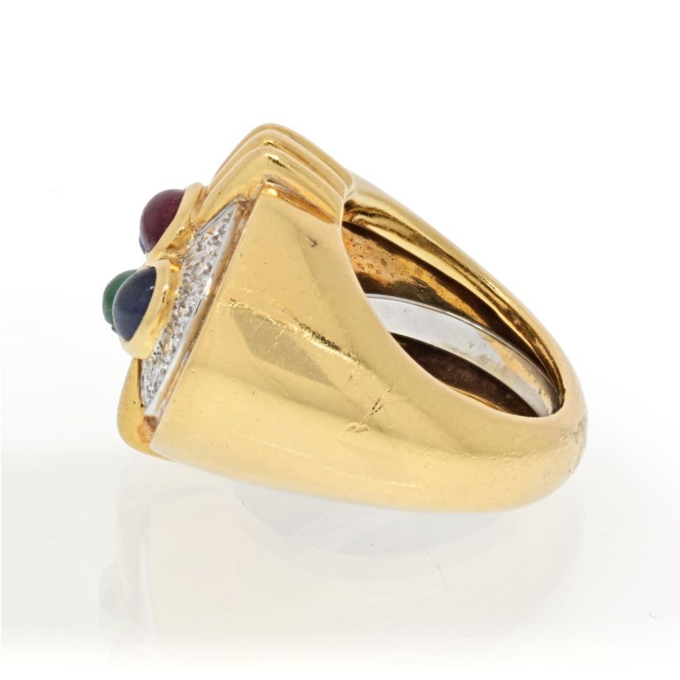 Bright and exciting this David Webb Multi Color Gemstone And Diamond Ring is in great condition and comes as a part of a ring and earrings set. Mounted with cabochon rubies, sapphires and an emerald, paved with round cut diamonds.