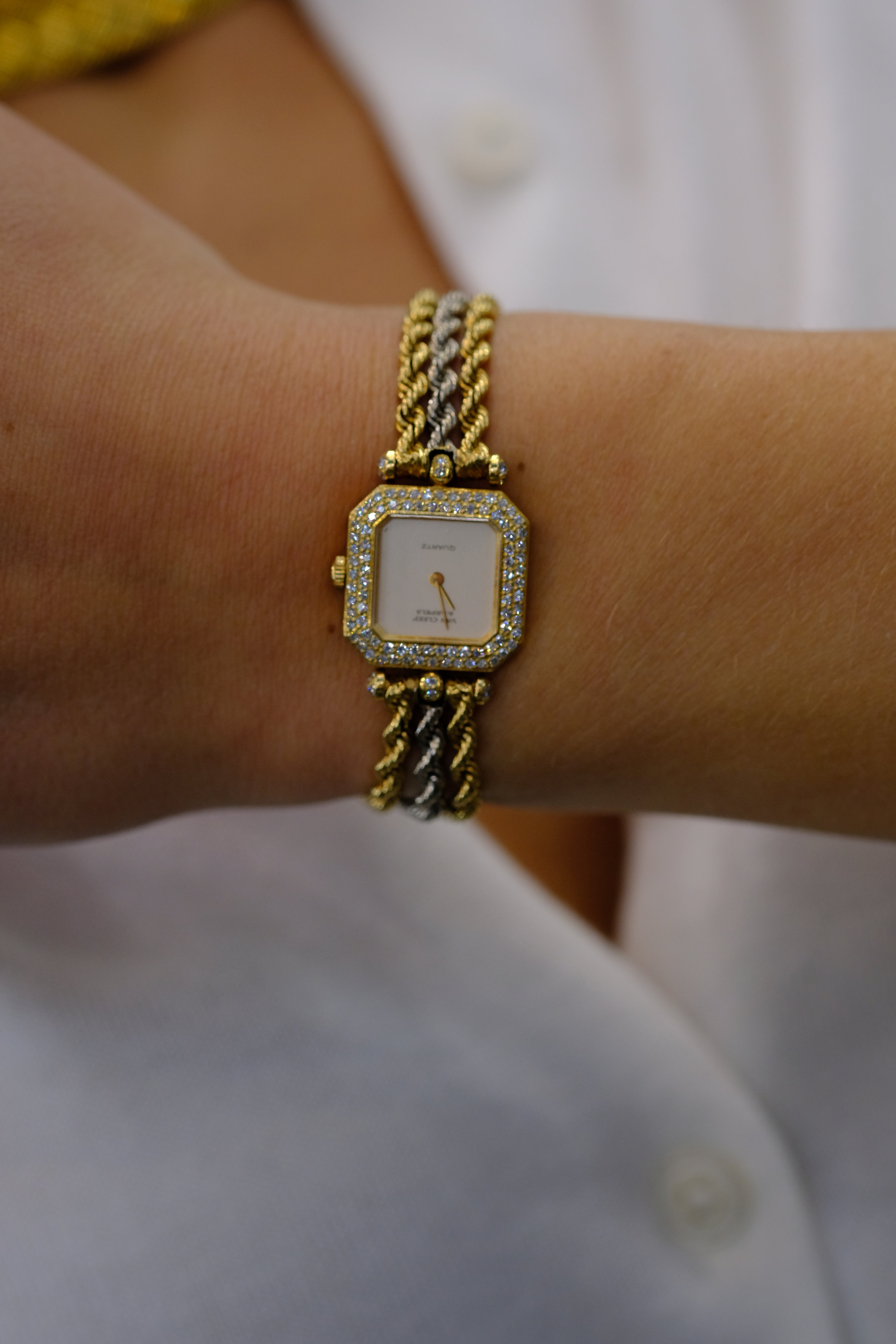 Ladies Vintage 18 Karat Van Cleef & Arpels Watch. The square-faced dial is framed in diamond bezel and the band has a triple rope weave pattern. Bracelet band is exactly 6.5 inches in length. Dial is 18mm wide.