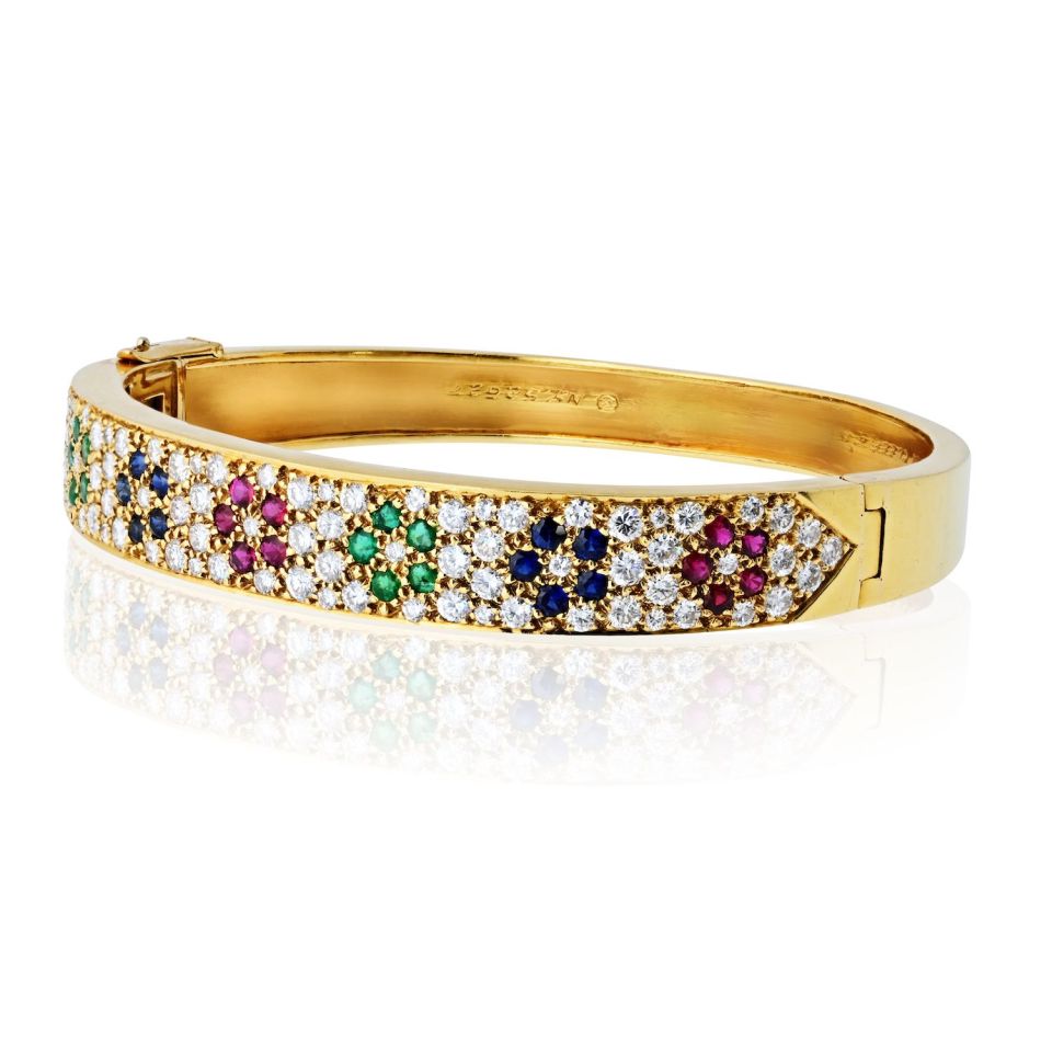 Van Cleef & Arpels 18K Yellow Gold Diamond And Multi Gem Flower Motif Bangle Bracelet