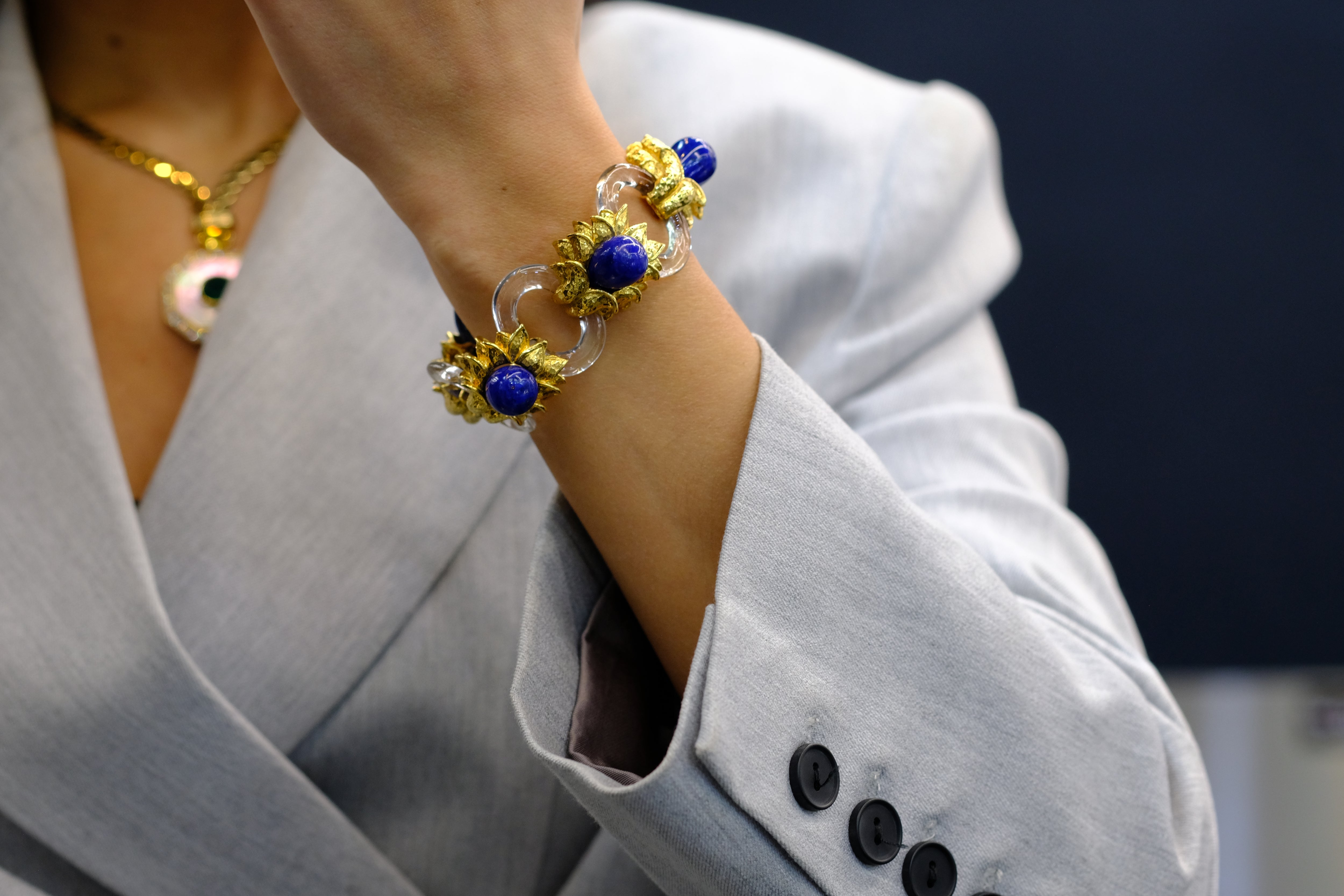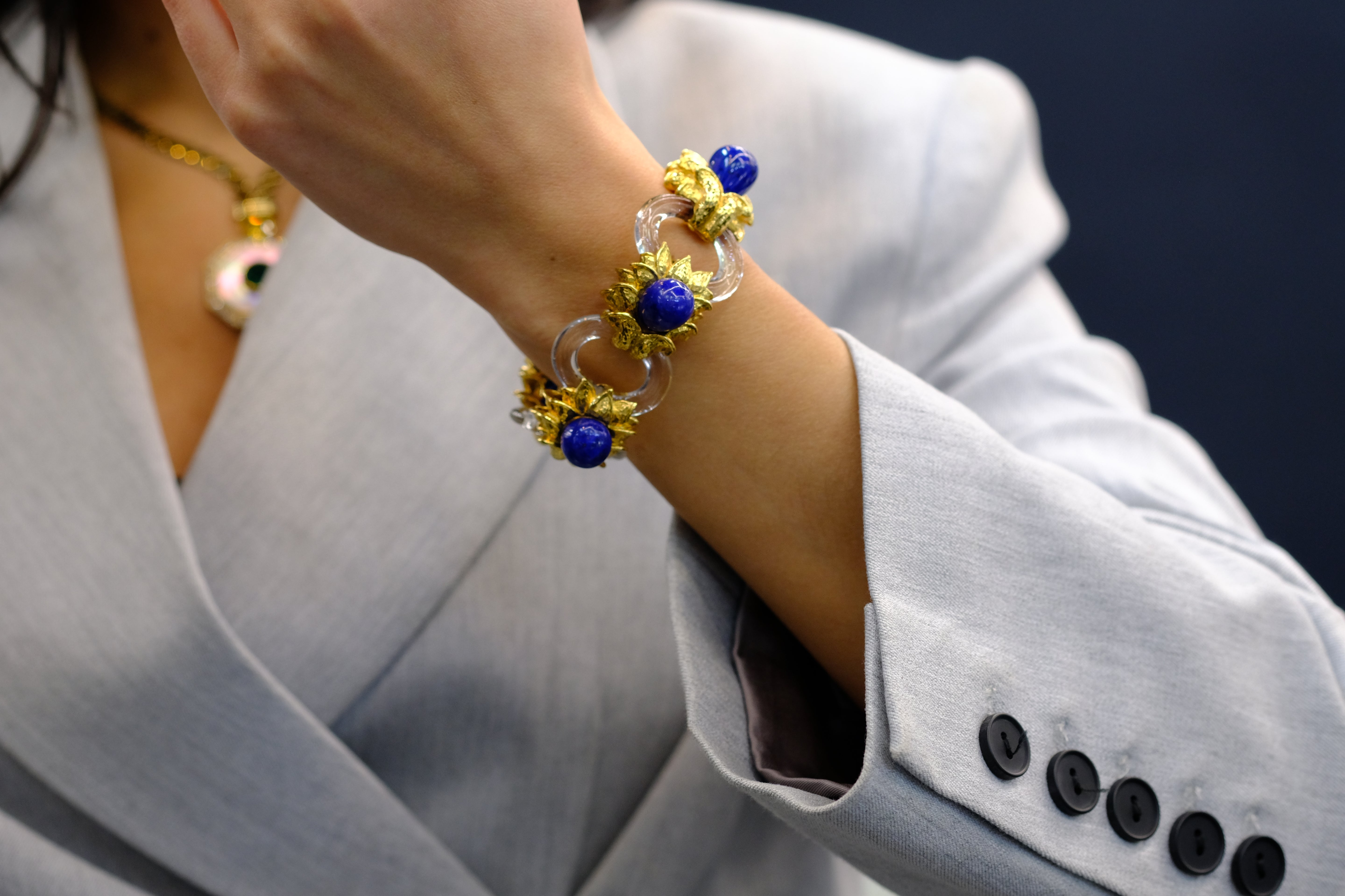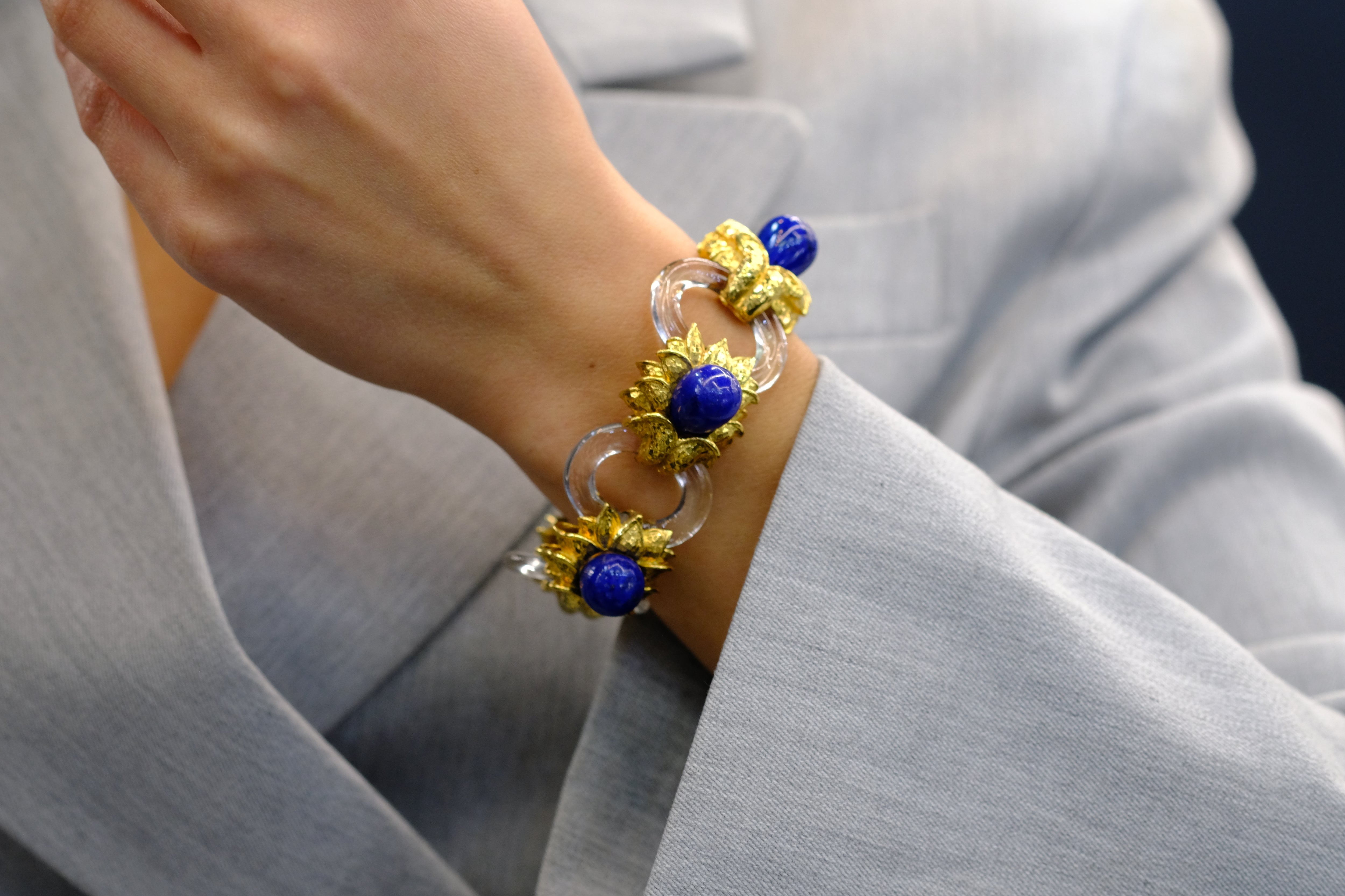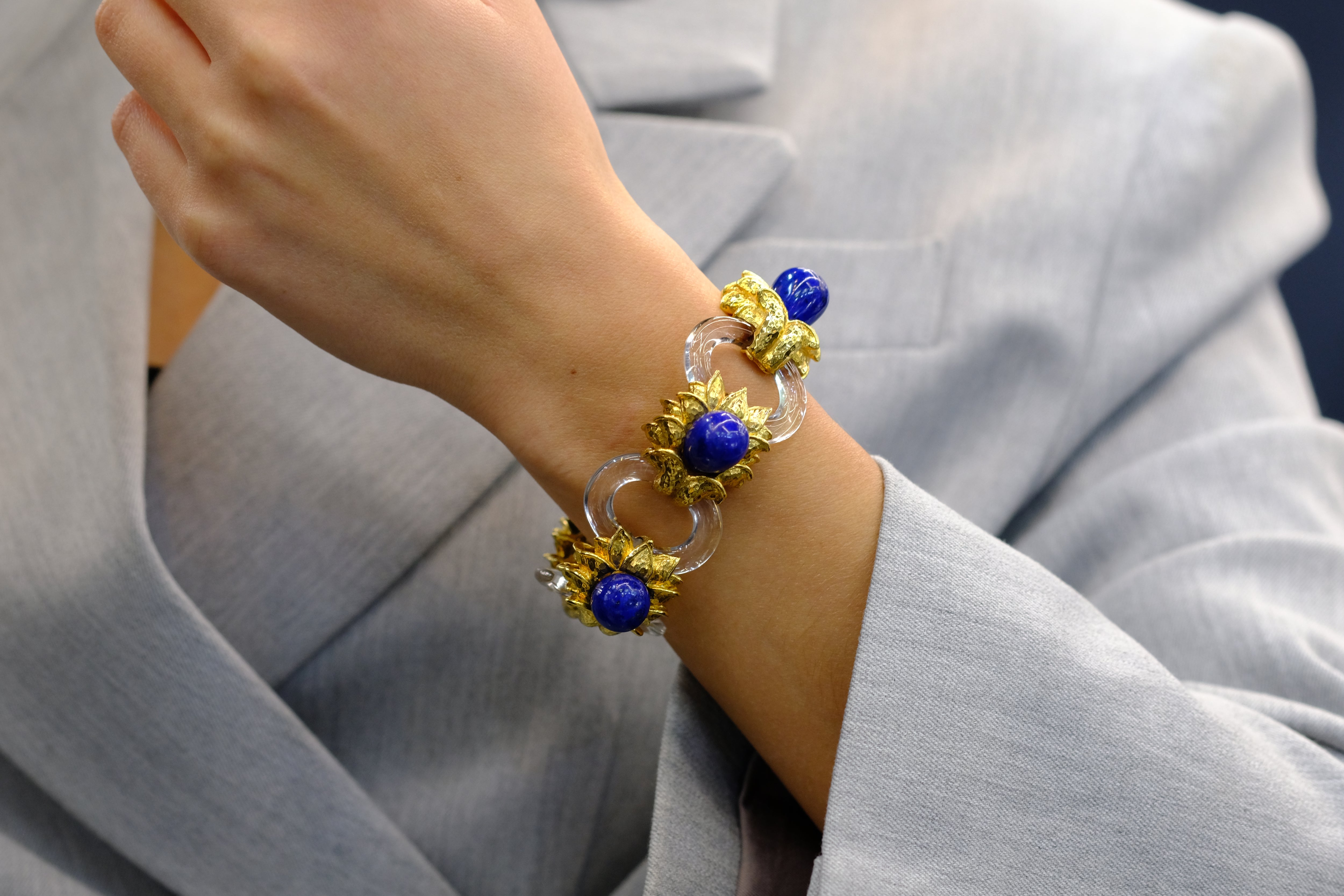 David Webb Platinum & 18K Yellow Gold Rock Crystal Lapis Floral Style Bracelet