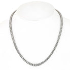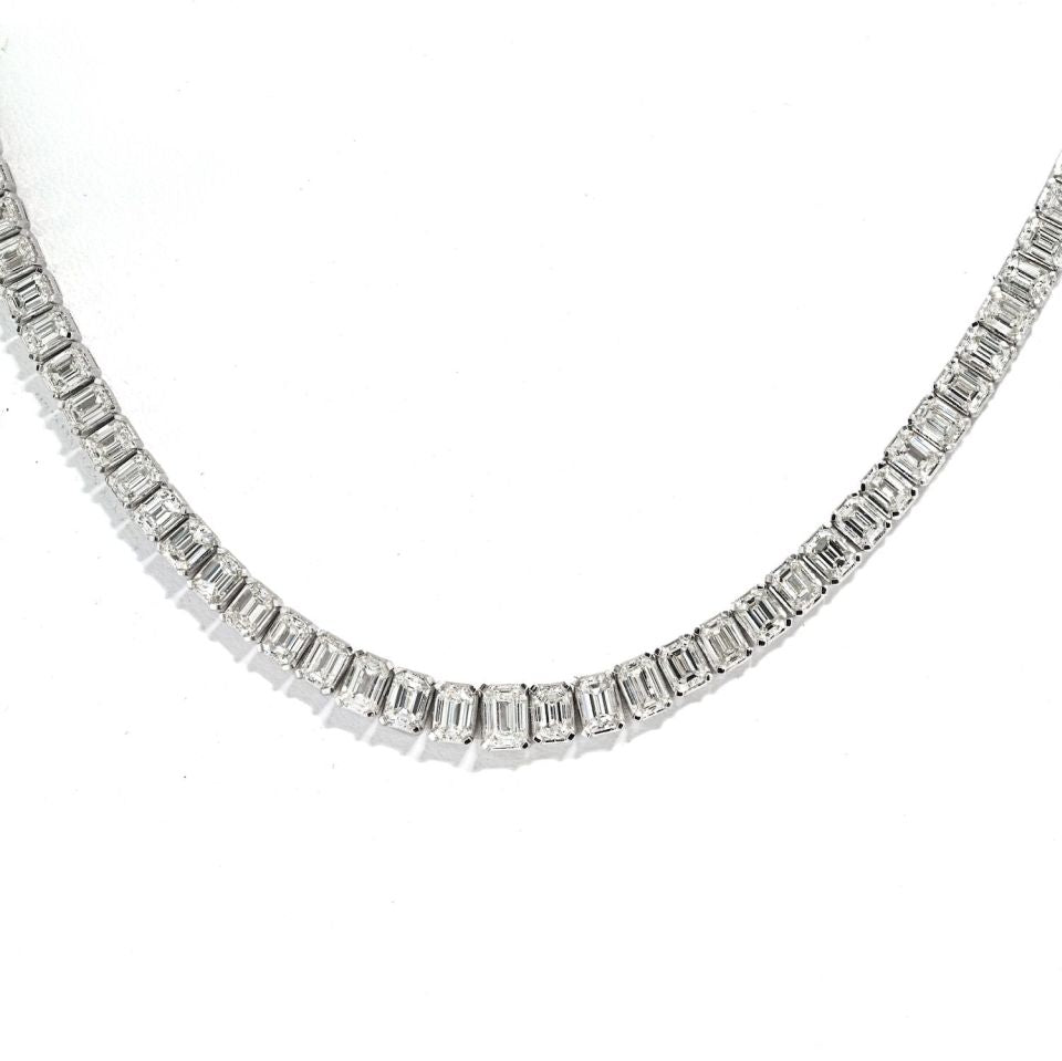 Elevate your elegance with our 18K White Gold 26.00cttw Emerald Cut Diamond Tennis Necklace, a true masterpiece of refined luxury. This exquisite piece boasts a captivating arrangement of 136 graduated emerald-cut diamonds, meticulously set to create a stunning visual display.