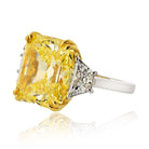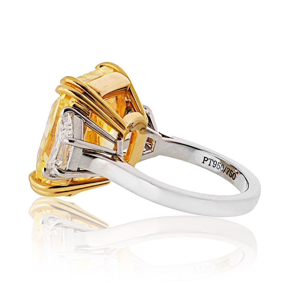 A breathtaking three-stone engagement ring featuring an 18.28ct Fancy Vivid Yellow radiant-cut diamond of VVS1 clarity, GIA certified, with even color and no fluorescence. Flanked by 1.99ct trapezoid white diamonds, it#s set in platinum with an 18K yellow gold center mounting. Measuring 15.5 x 14mm, this near-square diamond radiates pure brilliance. Size 6, resizable. Fancy Vivid Yellow diamonds are among the rarest and most coveted, celebrated for their intense, luminous color and timeless allure.