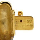 This solid 18K yellow gold bracelet by Pierino Frascarolo features a boldly sculpted three-dimensional lion#s head with an open mouth, accented by approximately 1.00 carat of prong-set round brilliant diamonds. Substantial in both look and feel, it measures 6.75 inches long and 1.5 inches at its widest, with a weight of 179 grams. In very good estate condition, the piece reflects Frascarolo#s celebrated craftsmanship and his signature animal motifs that defined his work in the 1960s.