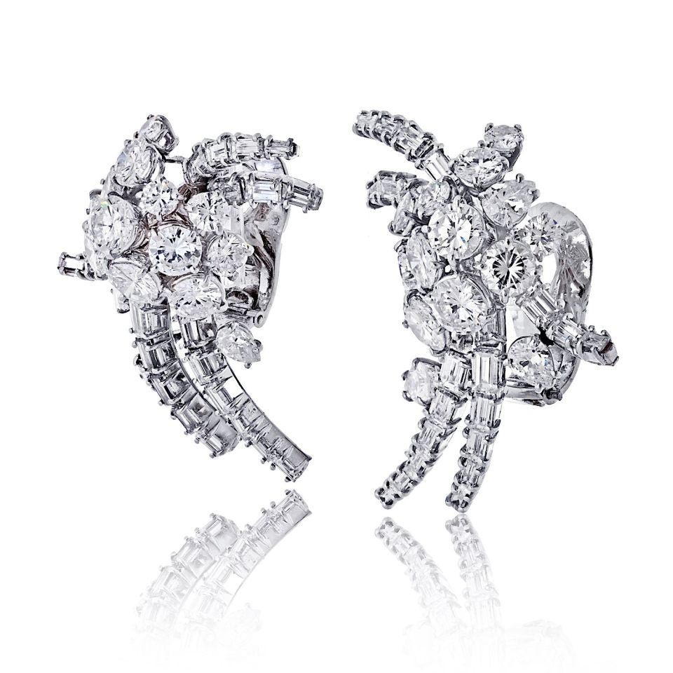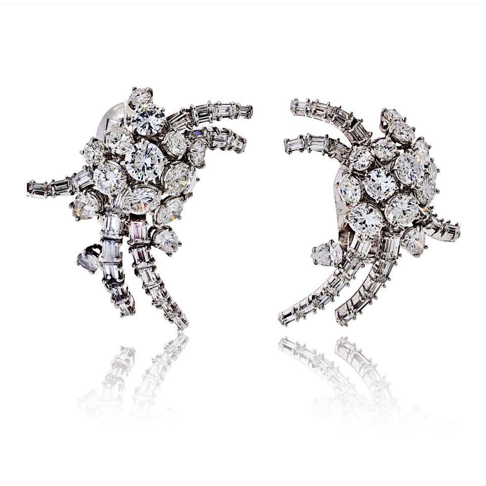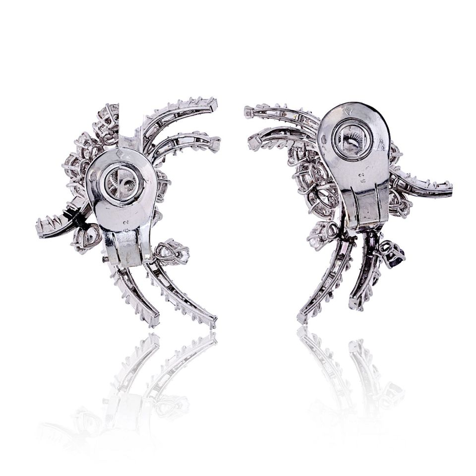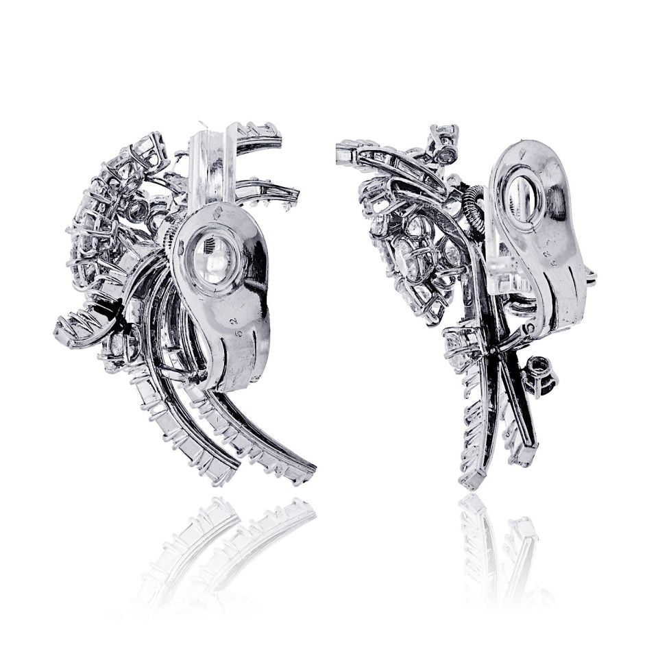 These exquisite estate diamond earrings from the 1960s are a timeless example of French elegance and craftsmanship. Handcrafted in platinum, they feature an intricate composition of round and baguette-cut diamonds totaling approximately 12 carats. The design radiates mid-century glamour, with graceful curves and a brilliant play of light across every facet. Measuring about one inch wide, the earrings are fitted with comfortable clip-on closures, though posts can be added if desired. A true vintage treasure, they embody sophistication, artistry, and enduring beauty.