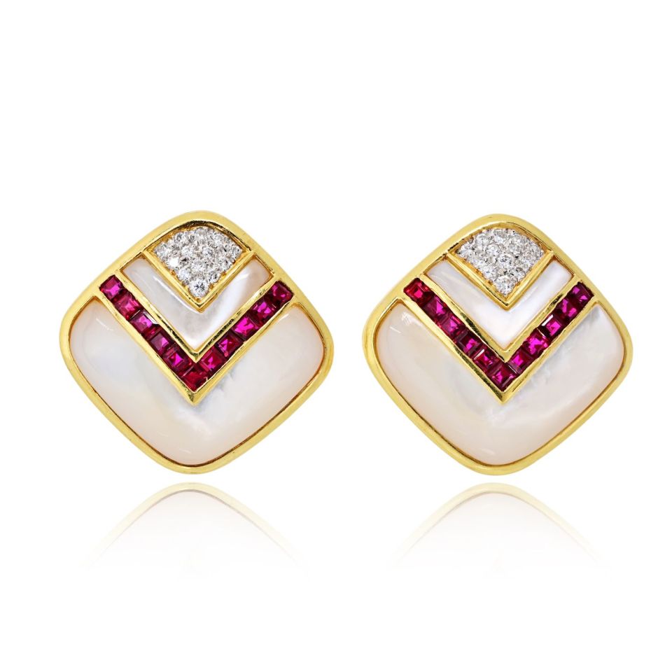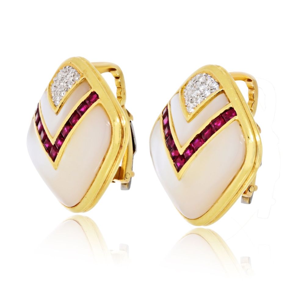Circa 1980's 18K Yellow Gold Mother Of Pearl, Diamond And Ruby Earrings.