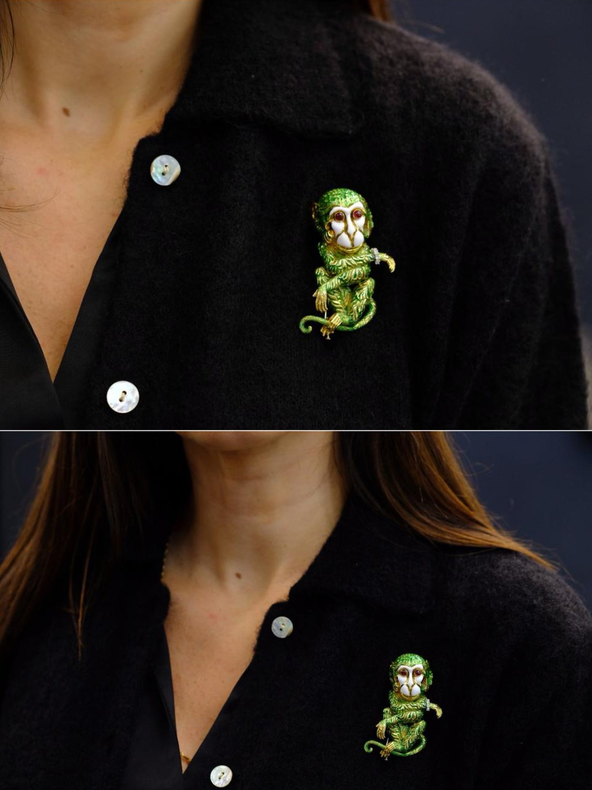David Webb Platinum & 18K Yellow Gold Gypsy Monkey Green Enamel Brooch