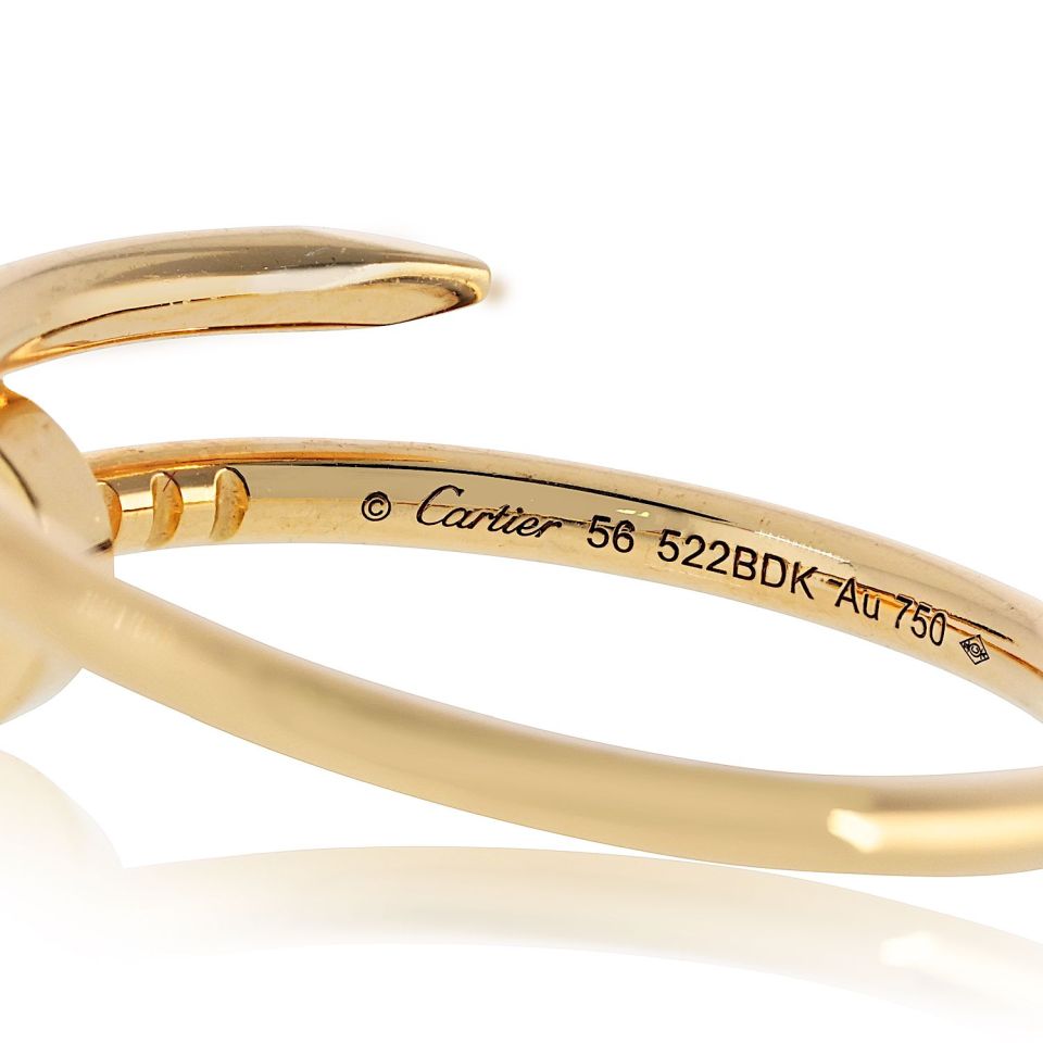 This Cartier *Juste un Clou* ring in 18K yellow gold is the elegant Mini edition of one of Cartier#s most iconic designs. Inspired by the simplicity of a bent nail, it transforms an everyday object into a symbol of strength, creativity, and refined rebellion. Weighing approximately 8 grams and sized at 56 (EU), the ring#s smooth, curved form wraps gracefully around the finger, reflecting Cartier#s mastery of modern sculpture in jewelry. Accompanied by its original Cartier box and certificate, this piece is both a wearable design statement and a collectible emblem of timeless luxury.