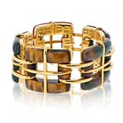 This vintage Tiffany & Co. bracelet is a striking example of the house#s bold hardstone designs. Crafted in 18K yellow gold, it features a series of cushion-shaped panels, each set with a richly colored natural stone. The bracelet showcases an exceptional mix of heliotrope, tiger#s-eye, moss agate, carnelian, and iron tiger#s-eye, creating a vivid interplay of earthy greens, reds, browns, and golden chatoyance.