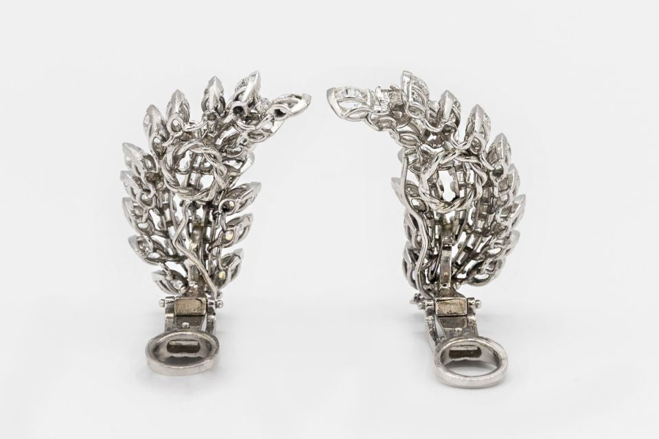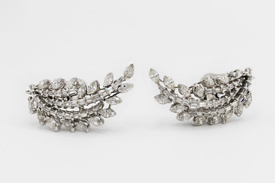 These well designed and handcrafted ear clips from ca. 1935 are beautifully shaped in the form of leaves which elegantly flow up the ear and are set with a total of 10.00cts white baguette and marquise cut diamonds.
