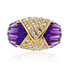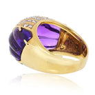 Estate 18K Yellow Gold Amethyst And Diamond Ring. Cocktail ring for everyday wear. Rich purple amethyst is artfully carved and is accented with round cut diamnds over its top.