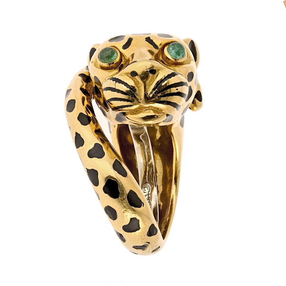Leopard ring with green emerald eyes.