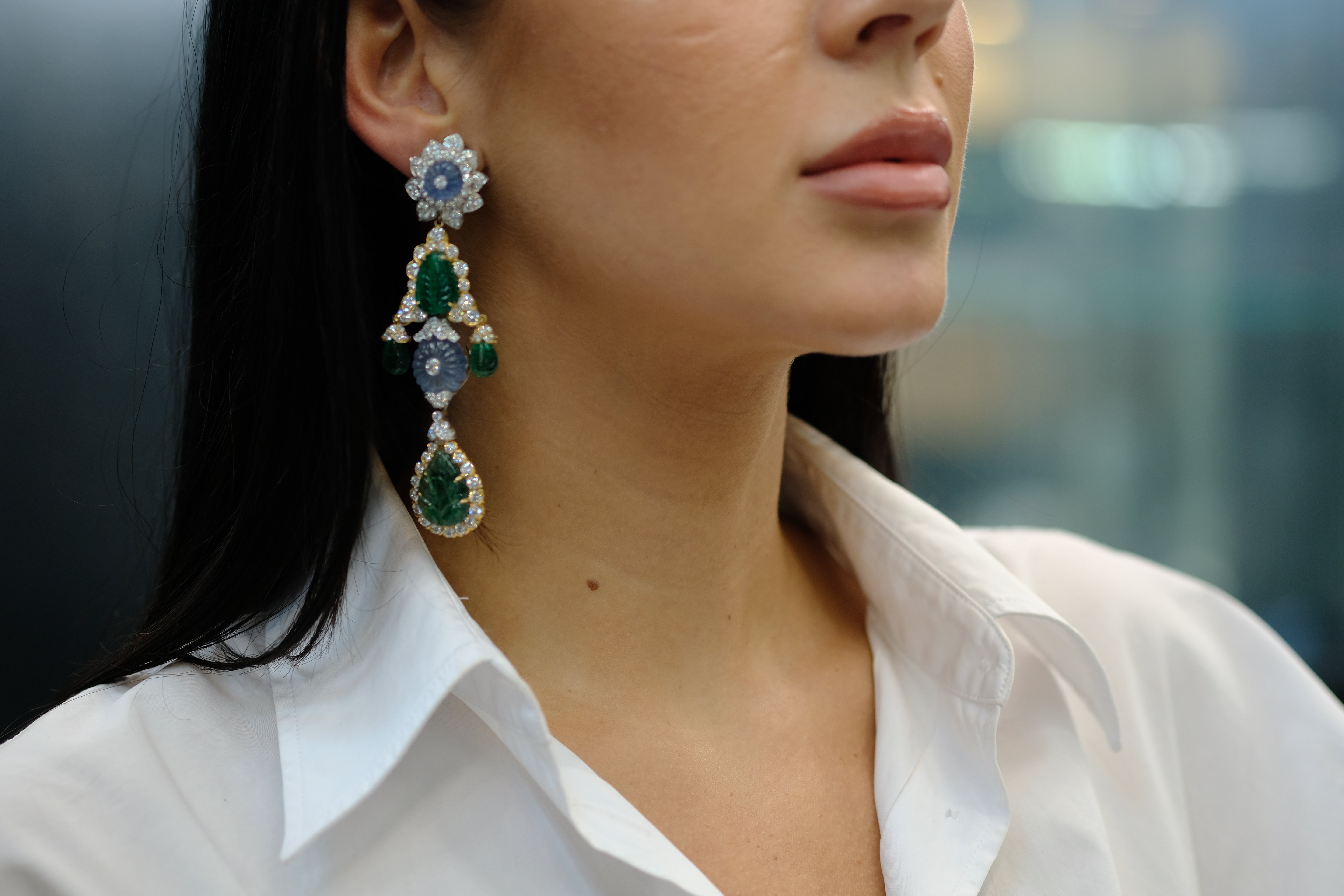 David Webb Girandole Carved Emerald And Diamond Dangle Earrings
