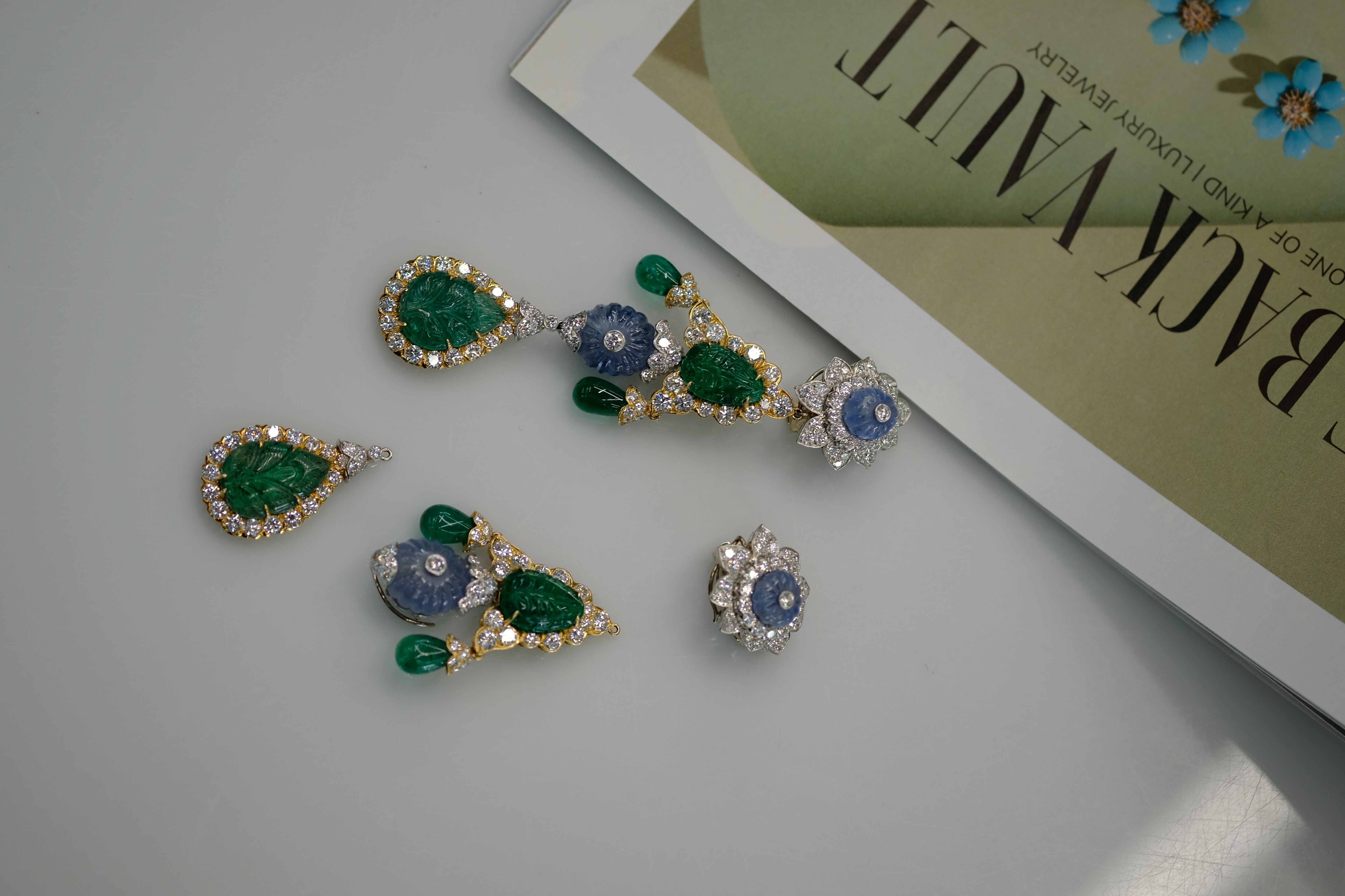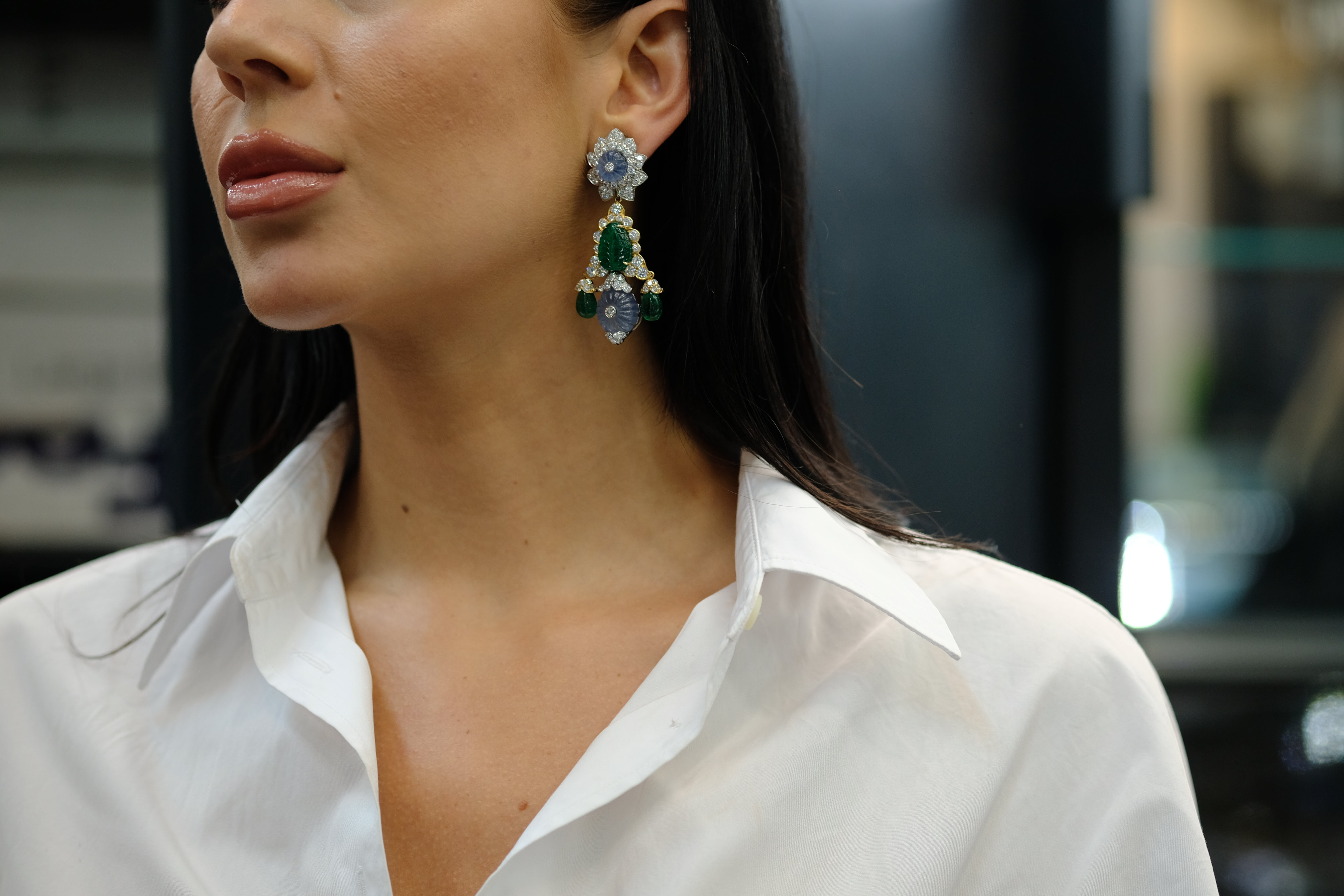 David Webb Girandole Carved Emerald And Diamond Dangle Earrings