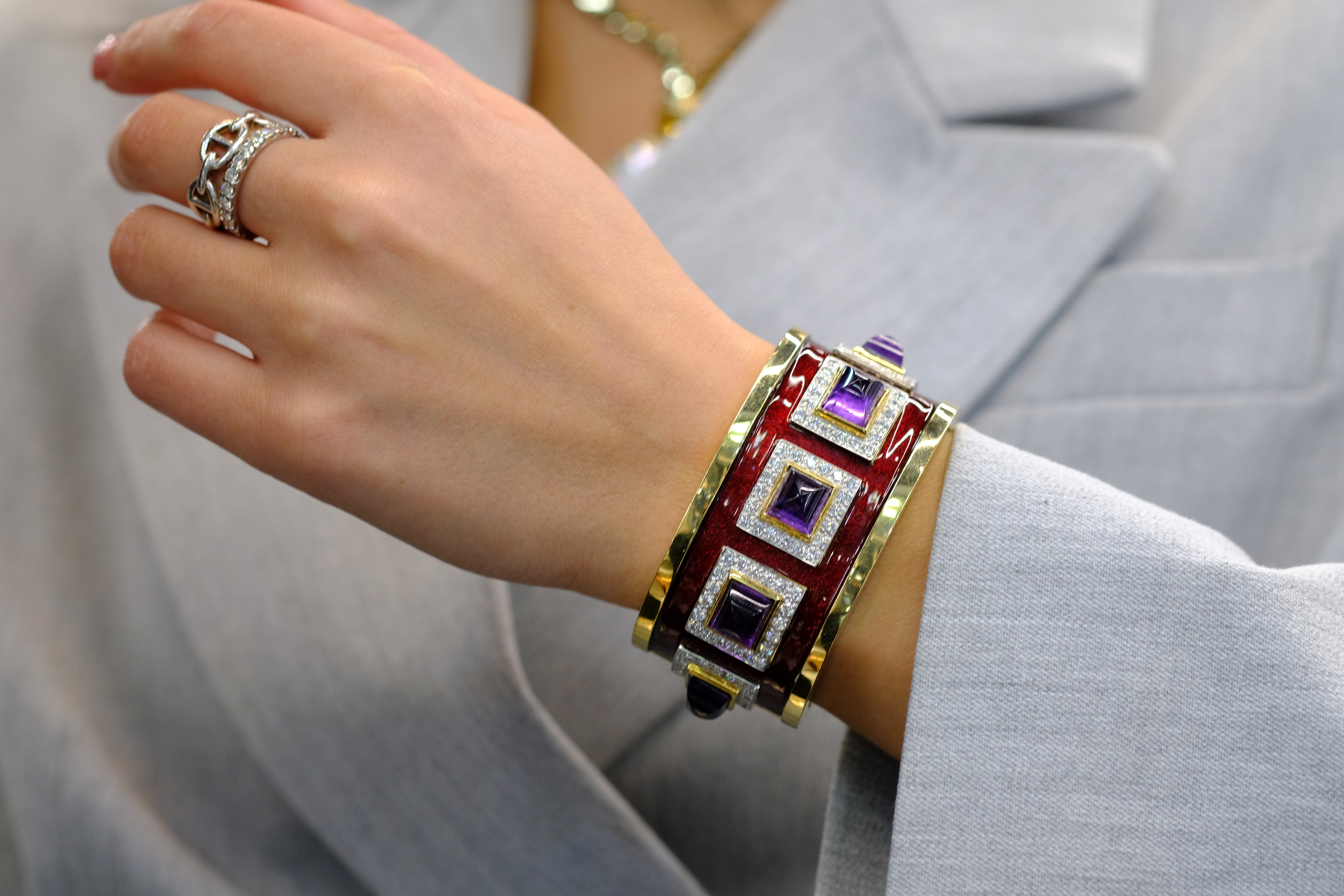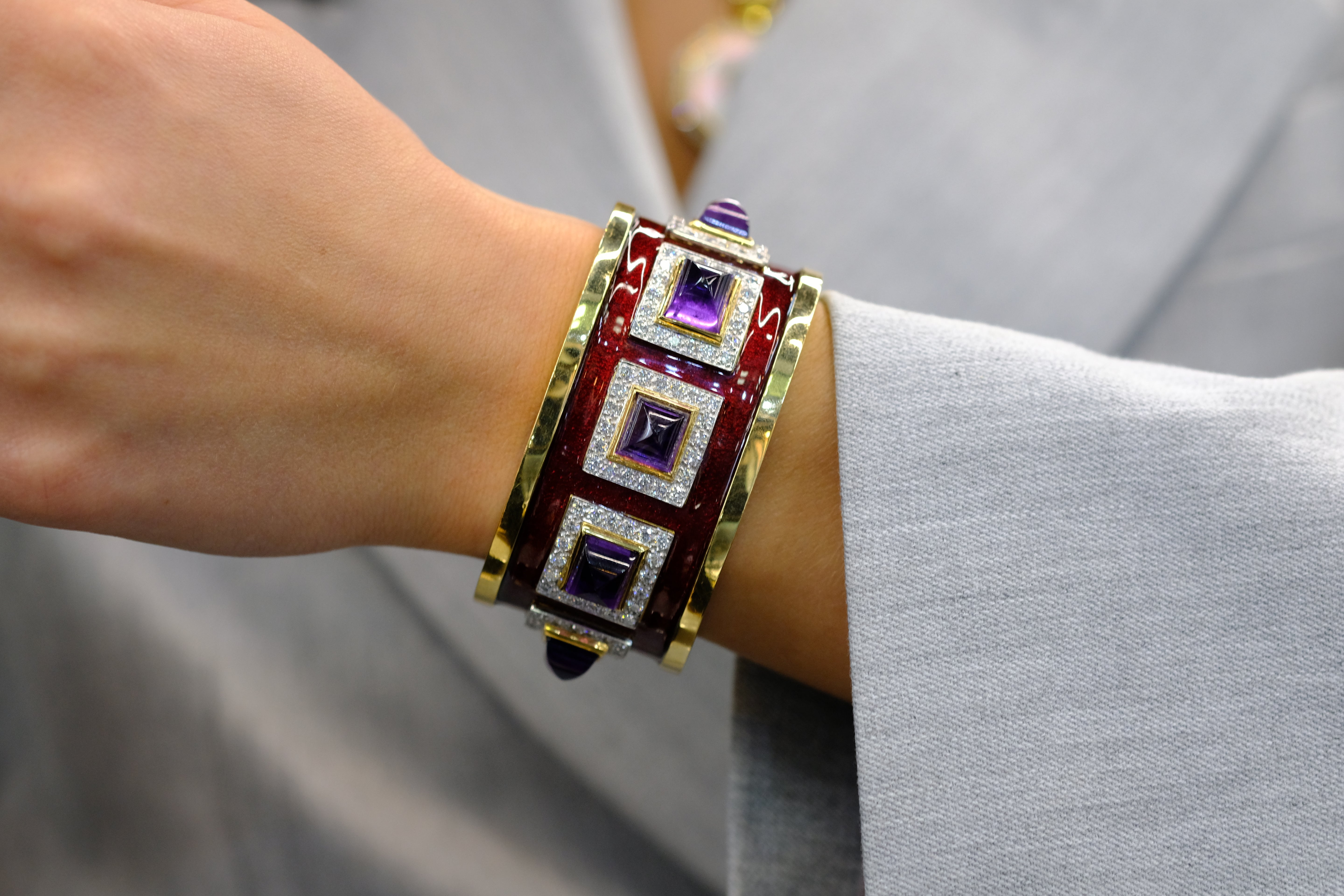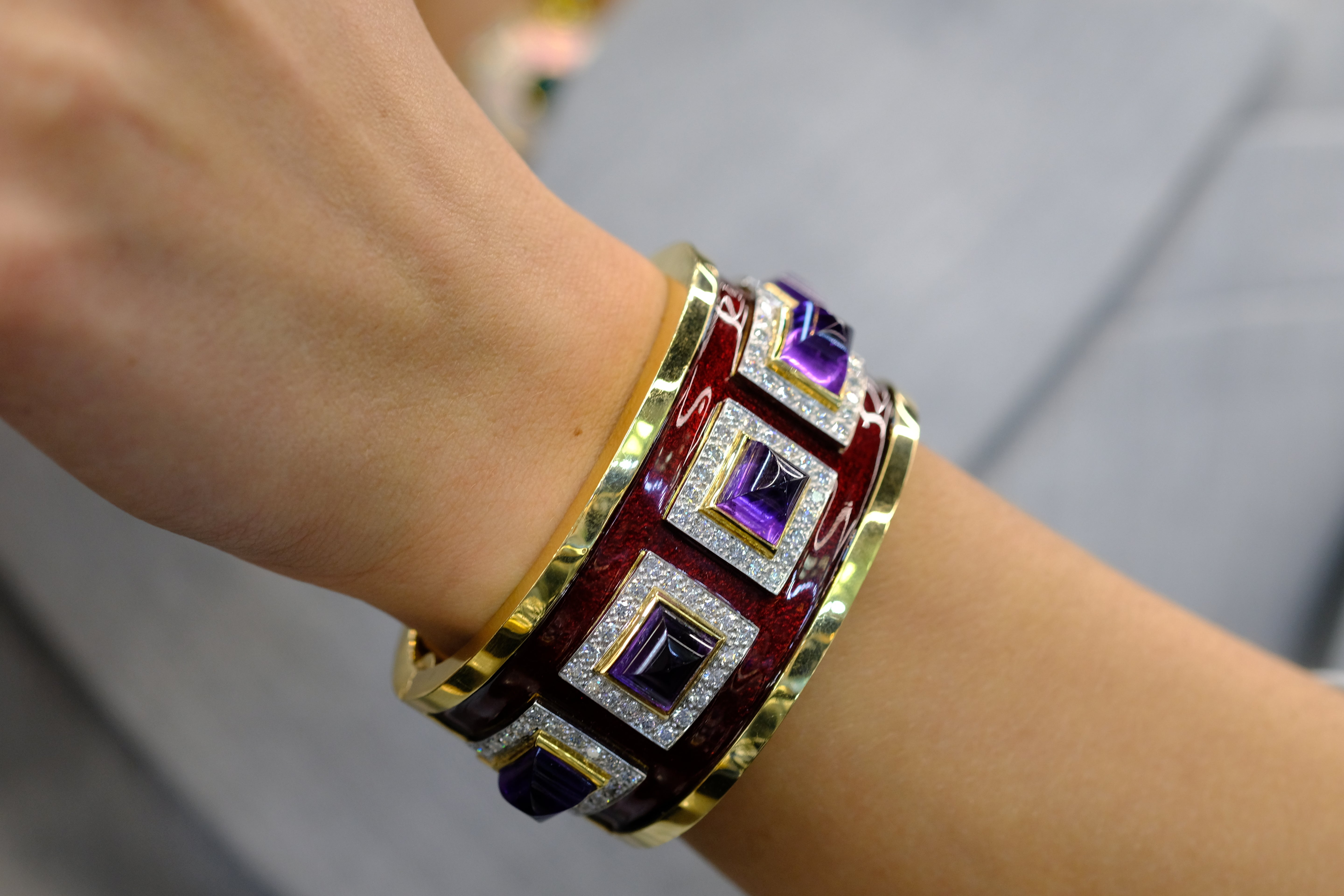 David Webb Platinum & 18K Yellow Gold Bastille Sugarloaf Amethyst Red Enamel Diamond Cuff Bracelet
