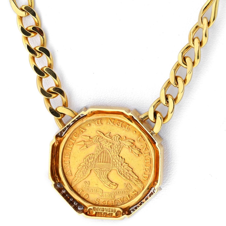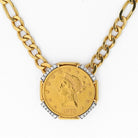 Featuring a U.S. $10 coin, the front with the Liberty Head, reverse with an eagle, accented by round diamonds, suspended from a curb link chain.