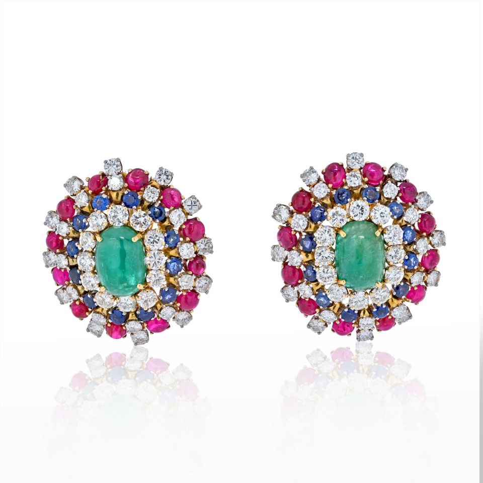 David Webb Multicolor Platinum & 18K Yellow Gold Emeralds, Ruby, Sapphire, Diamonds Earrings