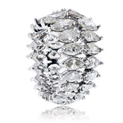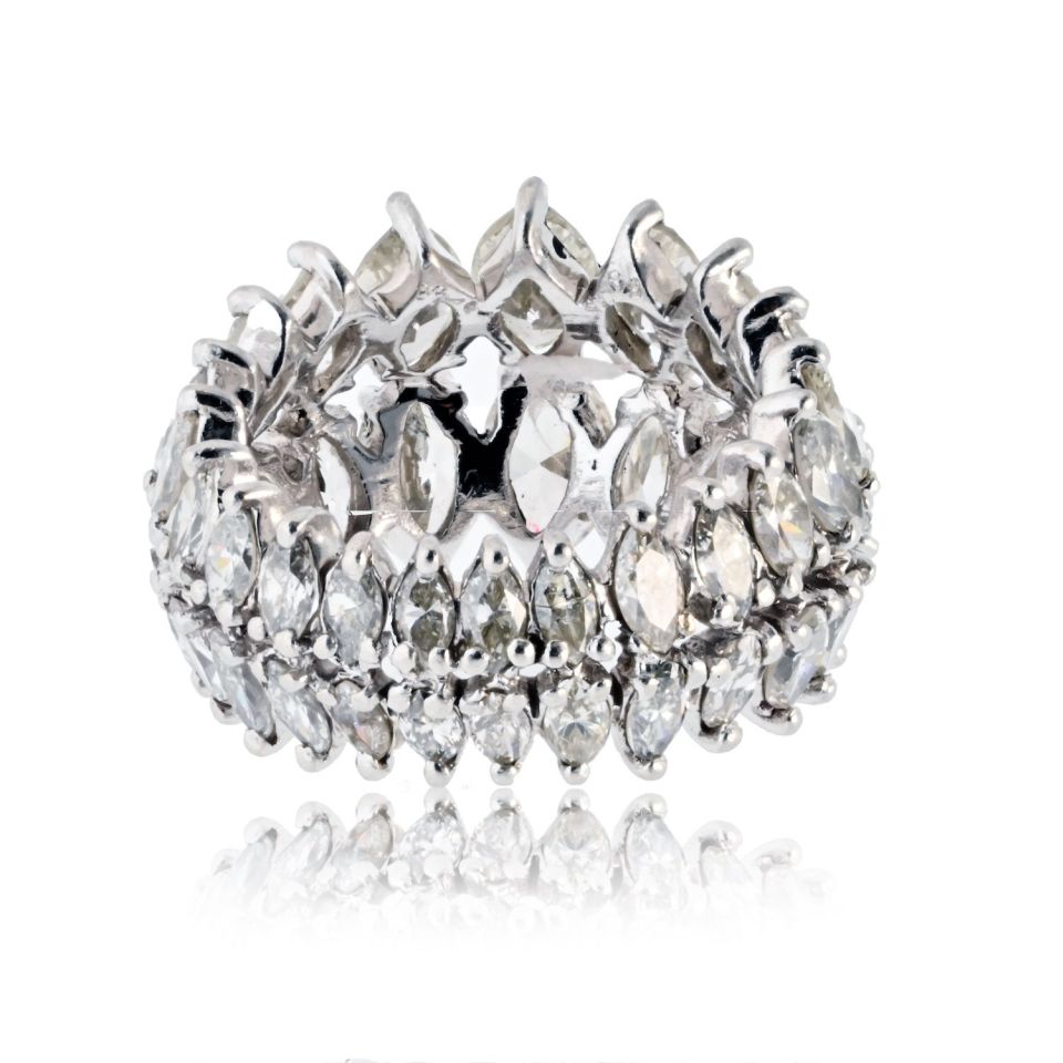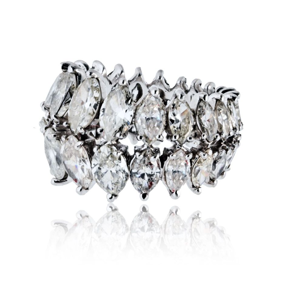 This stunning platinum eternity band features **8.00 carats total weight** of marquise-cut diamonds arranged in a unique graduated design. Larger diamonds are prominently set on top, while smaller marquise diamonds continue seamlessly around the band, creating a beautifully balanced and elegant look. A timeless statement piece, this ring showcases exceptional craftsmanship and brilliance, making it a perfect addition to any fine jewelry collection.