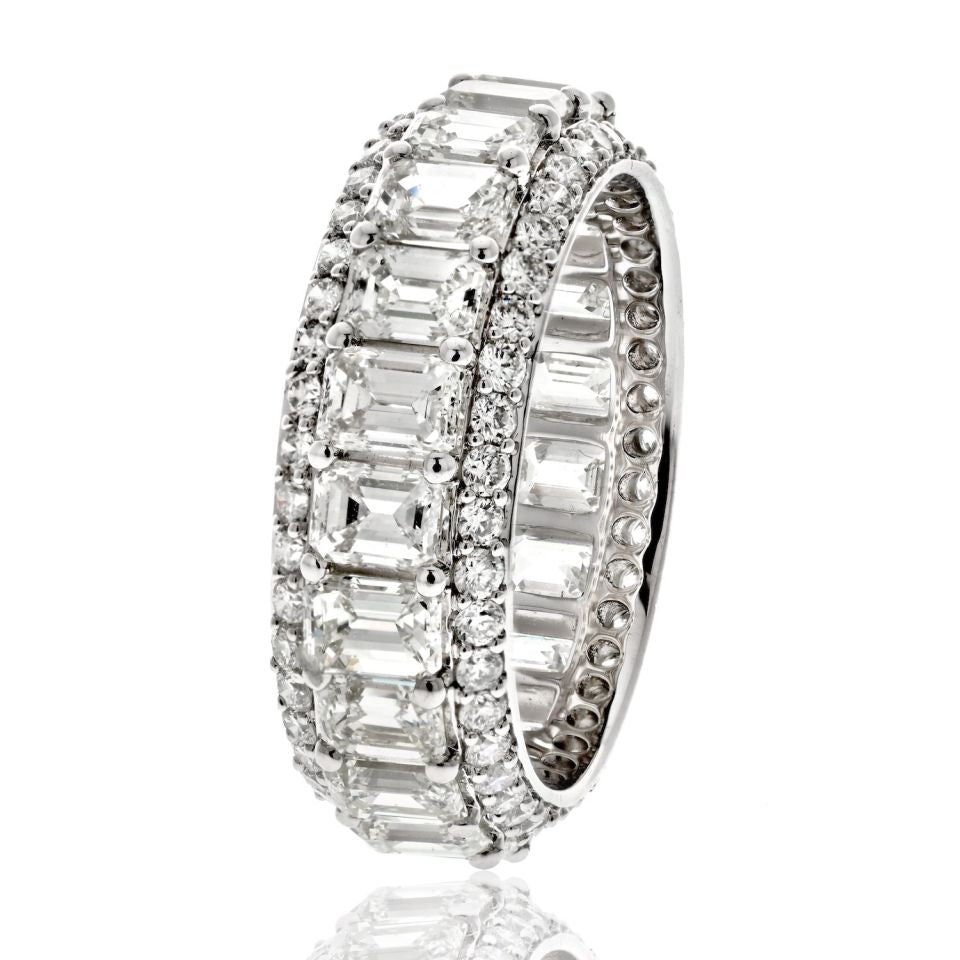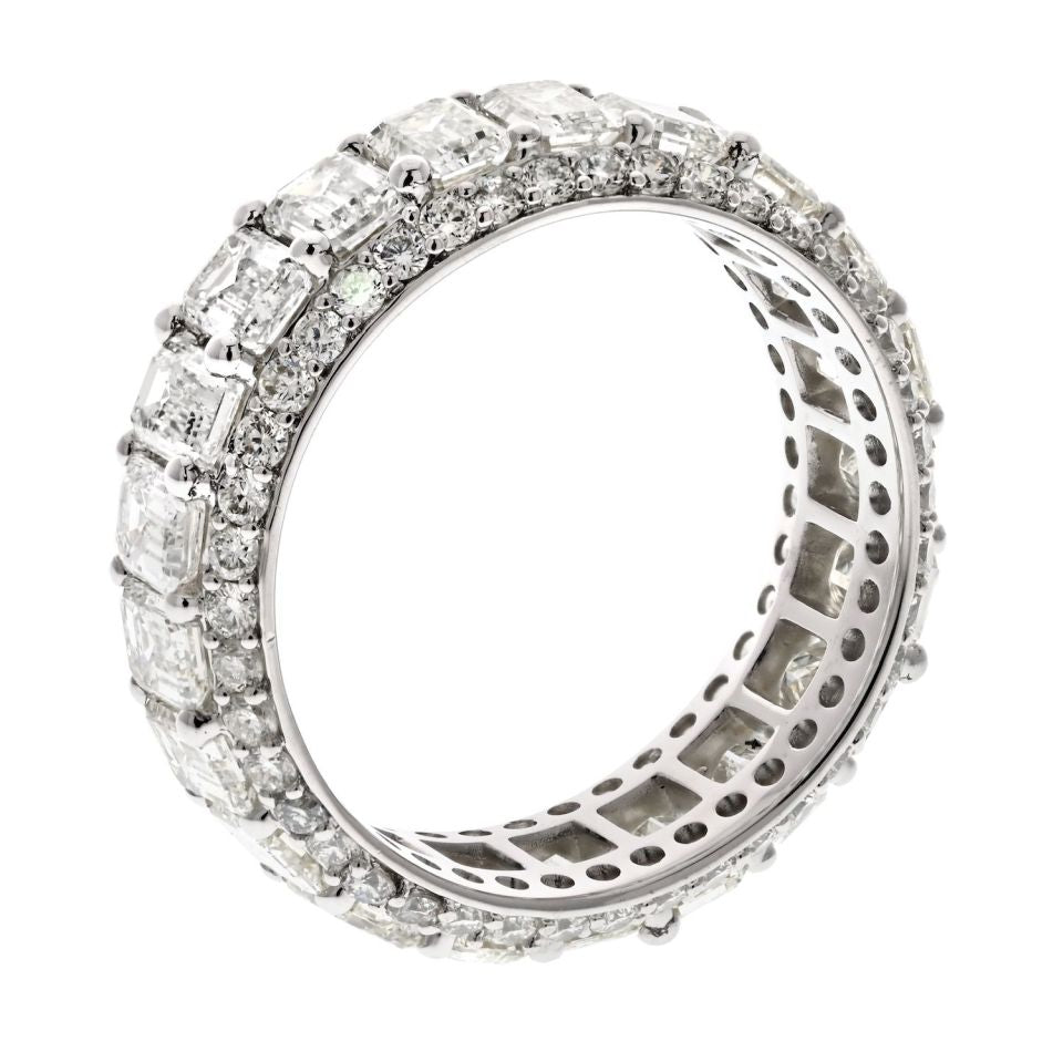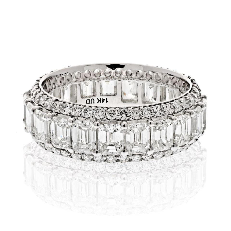 Newly made this classic emerald cut and round cut diamond eternity band is an excellent choice if you are shopping for an exciting wedding band or an anniversary ring. Crafted in 14k white gold with clean white emerald cut diamonds and full cut rounds this ring provides a timeless and elegant look that will last a lifetime. The continuous line of diamonds set in a circle, which symbolizes an everlasting and unbreakable bond adds a unique and beautiful sparkle to your wedding day. Additionally, the diamonds in all our eternity bands are of a higher over commercial quality, G color on average VS-SI clarity, providing you with a more luxurious and quality look.