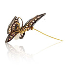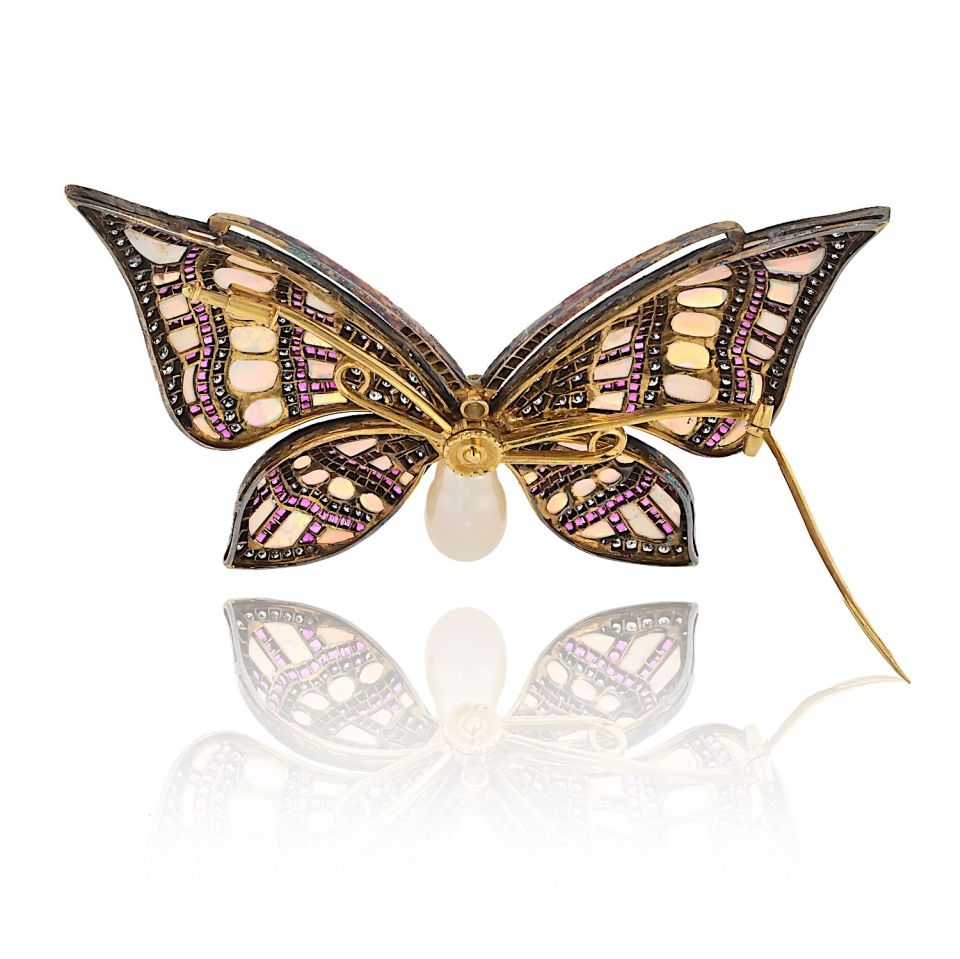 A true one-of-a-kind treasure, this exquisite butterfly brooch is masterfully handcrafted in 18K gold and silver. Featuring a mesmerizing composition of custom-cut gemstones, it evokes both whimsy and sophistication. The wings shimmer with soft blue opals and rich, deep red rubies, while a luminous baroque pearl forms the body. At the center, an old mine-cut diamond is bezel set, adding timeless charm and sparkle.