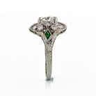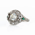 This is a beautiful diamond engagement ring made in Platinum during 1920's. Center diamond is a GIA certified Old European Cut diamond of a J color and a VS2 clarity. A touch of accent round cut stones and kyte cut emeralds to make this ring even more special.