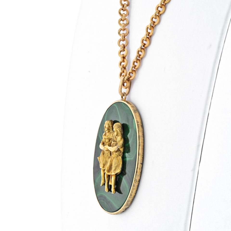 Large 18k gold and malachite Gemini pendant on a long chain, both by Buccellati. Depicting two girls holding hands. Malachite has a fracture through the center of the stone. The necklace is 25 in long, pendant - 73mm with bale x 48mm. Marked: Buccellati, Italy, 18k, 750.