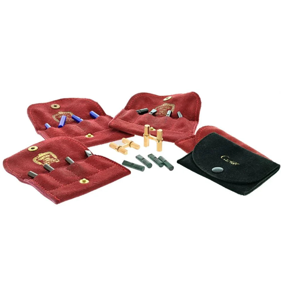 Exemplifying both elegance and versatility, these Cartier cufflinks are a masterpiece of design. Crafted in 18k yellow gold and hailing from the 1960s, they showcase a unique baton design that's perfect for daily wear. What truly sets these cufflinks apart are the changeable stone bars, which can be customized to suit your mood or outfit. The options include Lapis Lazuli, Malachite, and Black Onyx, allowing you to effortlessly adapt your style. Cartier's timeless craftsmanship and the timeless appeal of these cufflinks make them a must-have addition to any gentleman's collection.