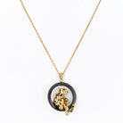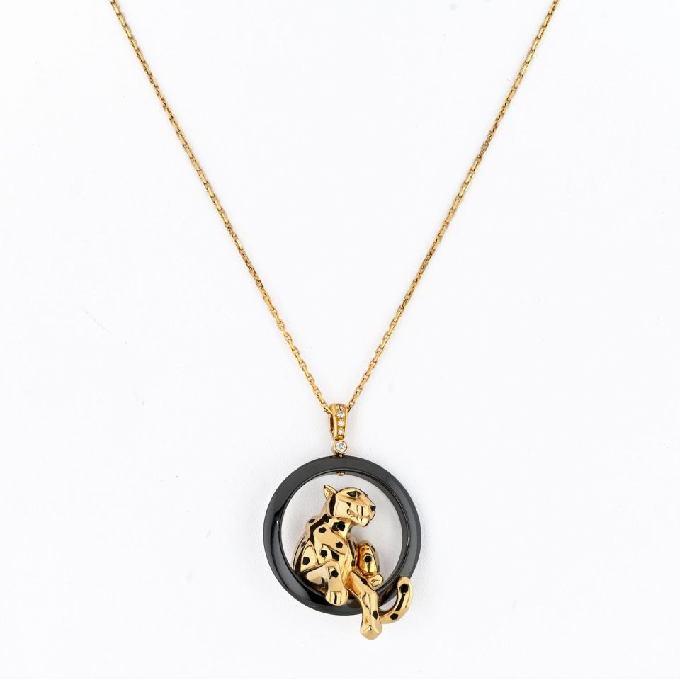 The pendant features a mesmerizing panther, gracefully perched on a ceramic ring, adorned with black lacquer spots that add a touch of drama to the design. The panther's onyx nose and piercing tsavorite garnet eyes beautifully contrast against the golden backdrop, while sparkling diamonds enhance the pendant's bail with radiance and brilliance.