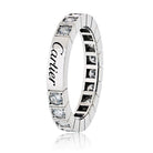 This Cartier Lanieres ring in 18K white gold is a contemporary expression of geometric elegance. Crafted with clean architectural lines, the design features square links set with sparkling round brilliant-cut diamonds that create a refined, modern rhythm around the band. Sized at 52 (EU), it embodies Cartier#s mastery of form and proportion#minimalist yet undeniably luxurious. The Lanieres collection is celebrated for its subtle sophistication, making this ring a perfect choice for everyday elegance or as a distinctive addition to a Cartier stack.