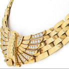 Absolutely enchanting! Behold the elegance of this 1980s Cartier Horus Eagle Collar, a masterpiece that seamlessly blends craftsmanship with artistic brilliance. The flexible and polished brick-link design graces the neckline, leading to a front adorned with a meticulously chased falcon motif and pave-set brilliant-cut diamonds, totaling an exquisite 4.05 carats.