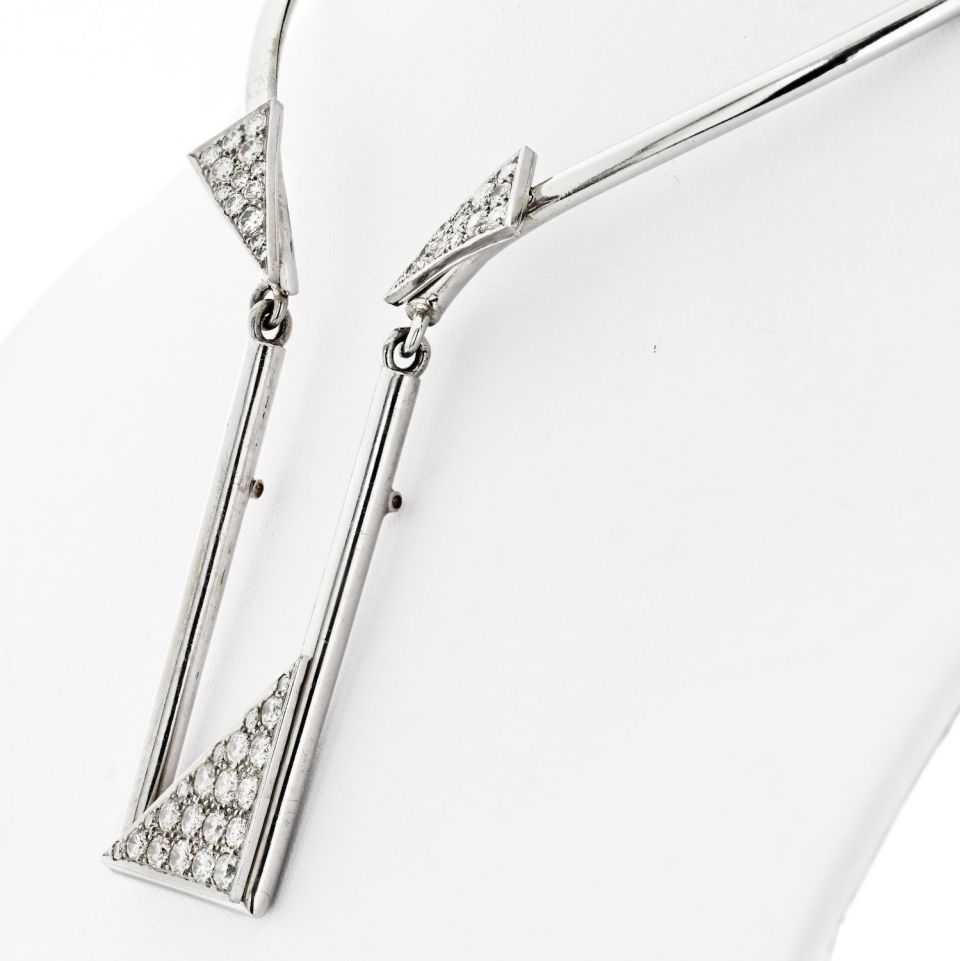 Crafted in 14k white gold this estate diamond collar is very unique. We see this collar being worn with a simple black dress or a strapless top so all the attention is on your neck and the necklace.