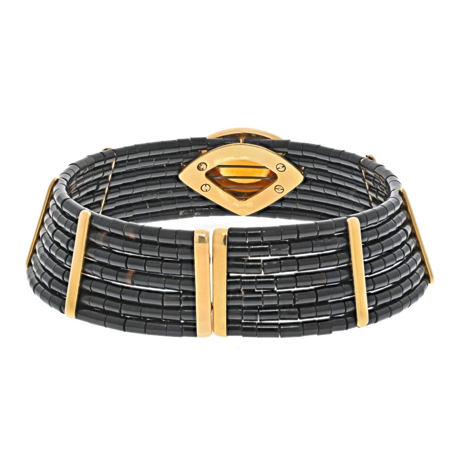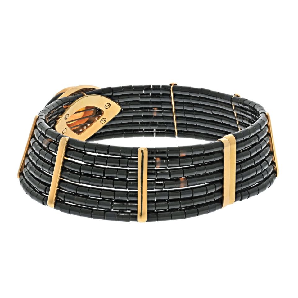 Very unusual this dramatic choker is a perfect piece for someone who has a long neck. Made of seven rows of cut black onyx circular bars mounted on strings enhanced with a large orange citrine in the center that is further decorated with round cut diamonds set in 18k yellow gold.
