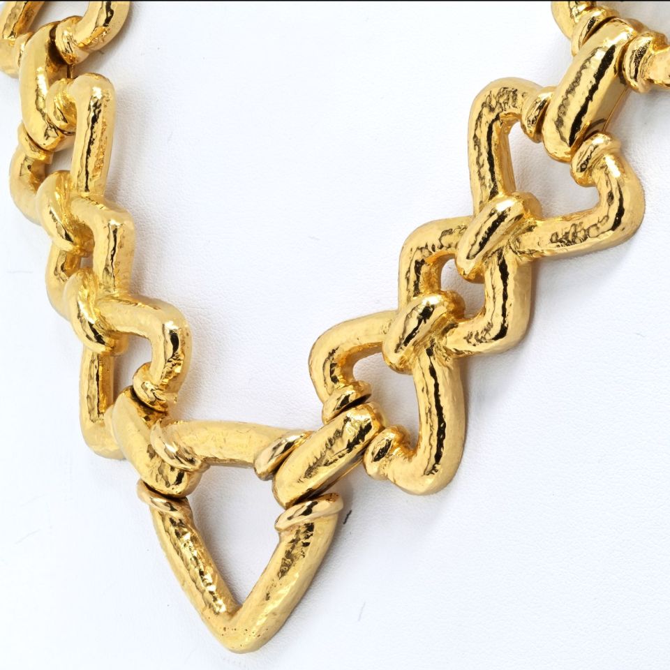 Crafted in rich 18 k yellow gold, the David Webb Hammered Link Long Convertible Necklace commands attention with its bold, sculptural chain links, each hand-hammered to a luminous, light-reflecting surface. When worn at its full 34" length it drapes as a show-stopping statement; yet the cleverly engineered convertible design allows it to be re-configured into a shorter necklace and a matching bracelet, offering style-flexibility for day or evening. At 217 grams of pure gold, this piece has true physical presence and is signed WEBB 18K as a mark of authentic maison