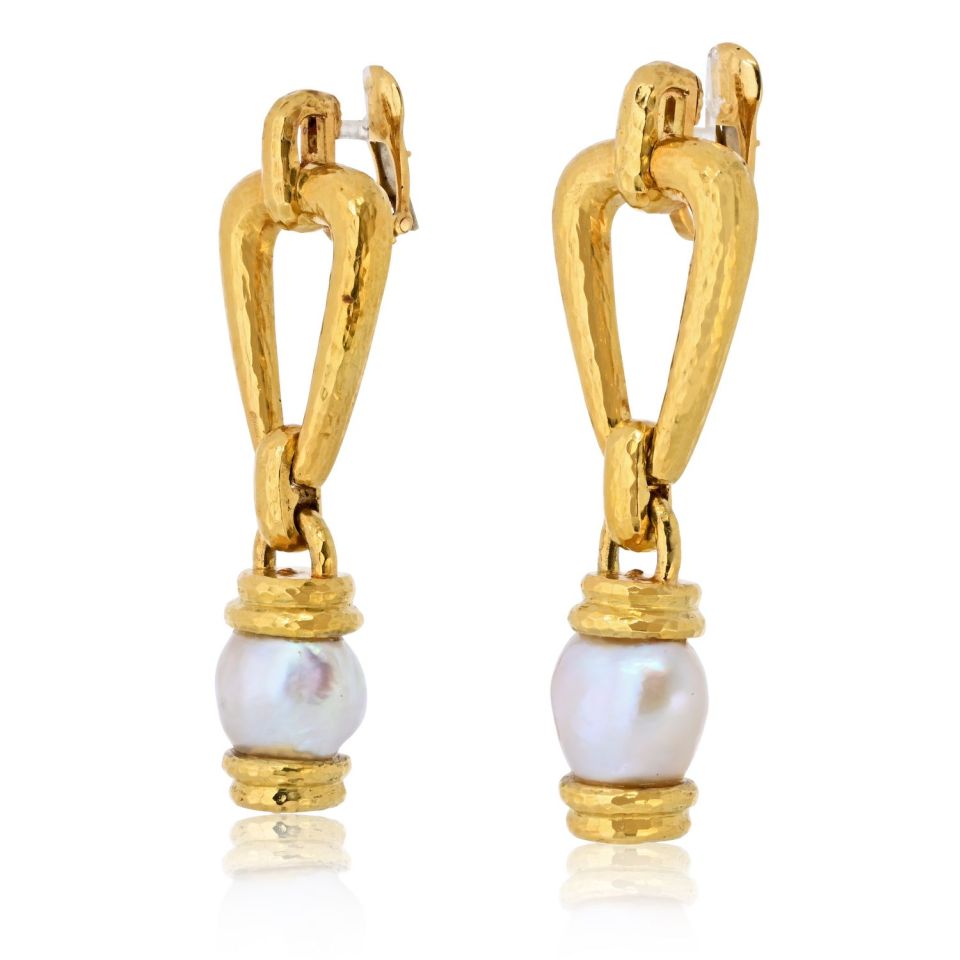 A striking pair of earrings by David Webb, showcasing the house#s iconic bold design language. Crafted in rich 18K yellow gold with the signature hammered finish, each earring is designed in an elegant pendulum style, suspending a luminous mabe pearl.