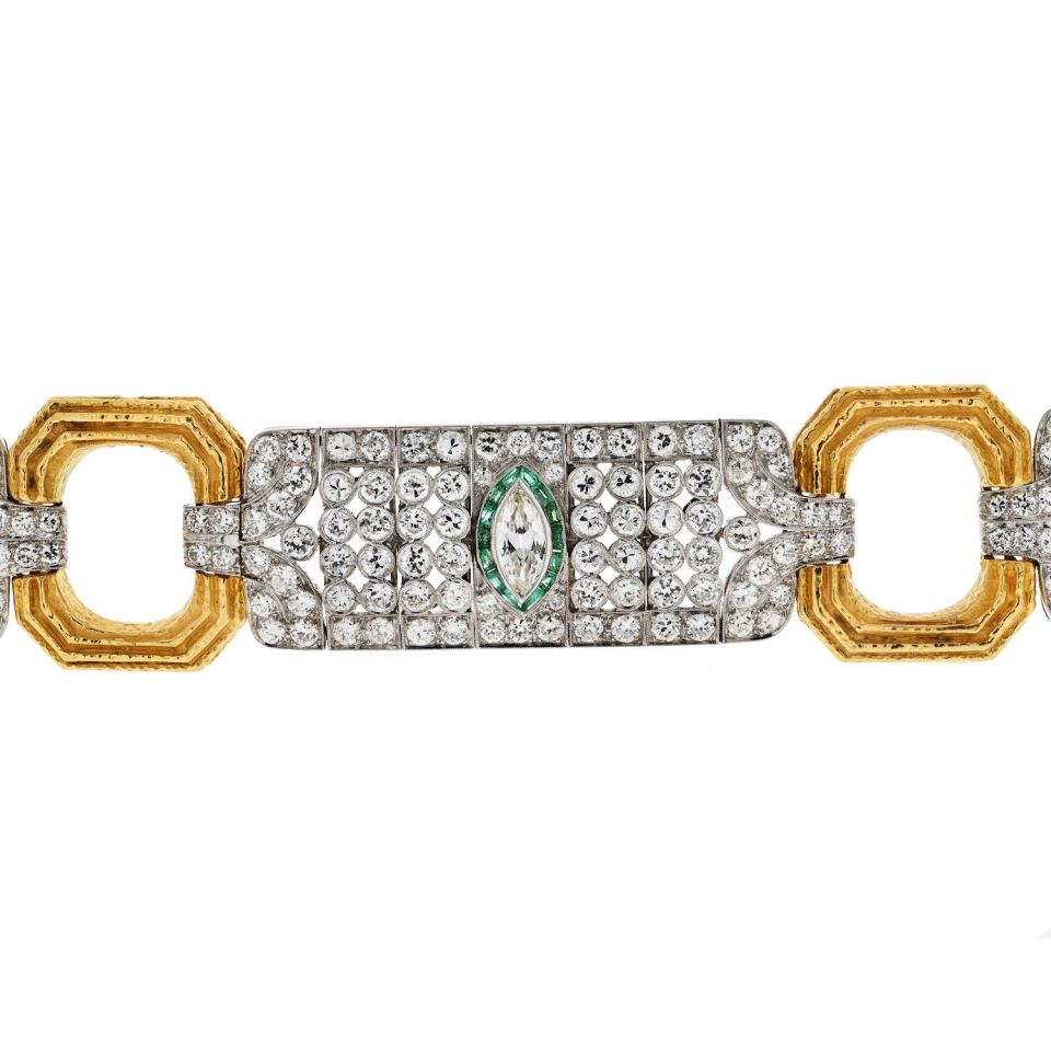 The David Webb collar necklace is a breathtaking piece of jewelry that exemplifies the exquisite craftsmanship and luxurious design for which the brand is renowned. Crafted in a combination of platinum and gold, this necklace is adorned with round diamonds across its entire surface, totaling a remarkable carat weight of 25.00cttw. The necklace features three diamond panels, at the center each highlighting an impressive marquise-cut diamond surrounded by green emerald accents. These central elements create a captivating focal point that adds a touch of elegance and vibrancy to the piece.