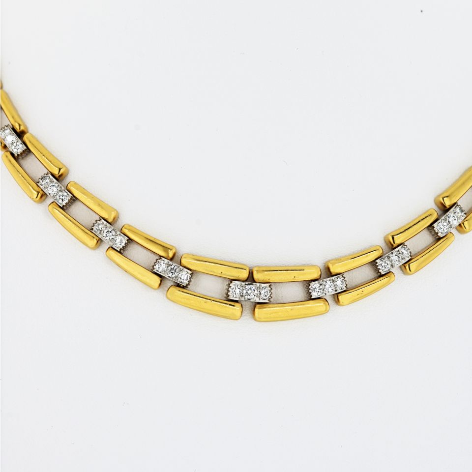 Simple yet chic this yellow gold link necklace by David Webb is more than just a chain. With diamond connectors adding a settle sparkle to your gold chain neckline this vintage jewel will certainly become a go-to in your jewelry box. Just about 16 inches long and about 7mm wide.