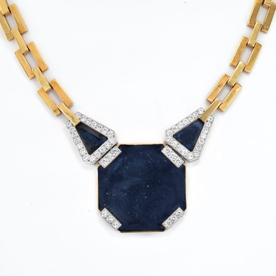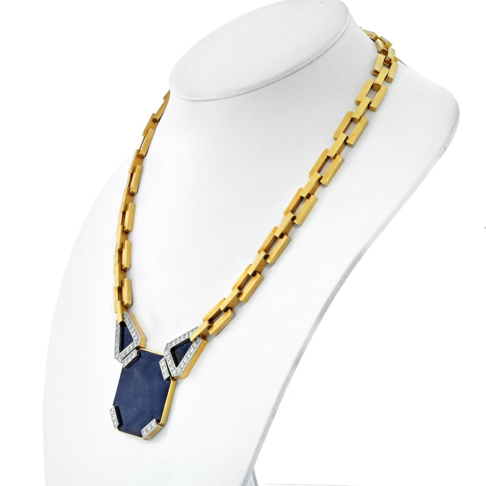 Because Great Jewelry Is Art. Shop this modern geometric bold chain necklace by David Webb. Crafted in 18K Yellow gold, featuring an octagonal onyx as a focal center piece suspended from an open link flat rectangular chain.