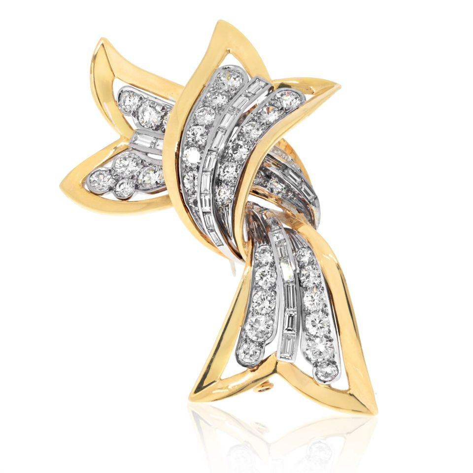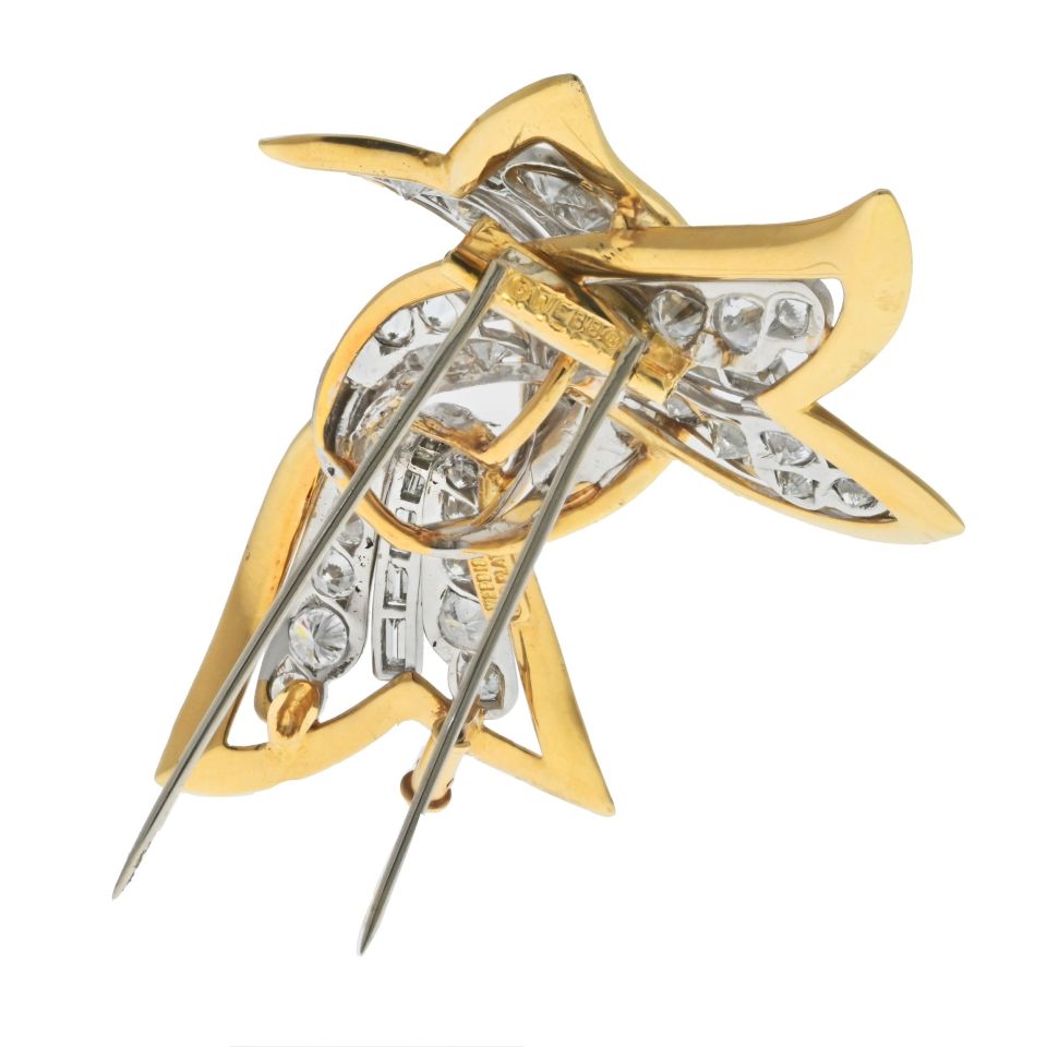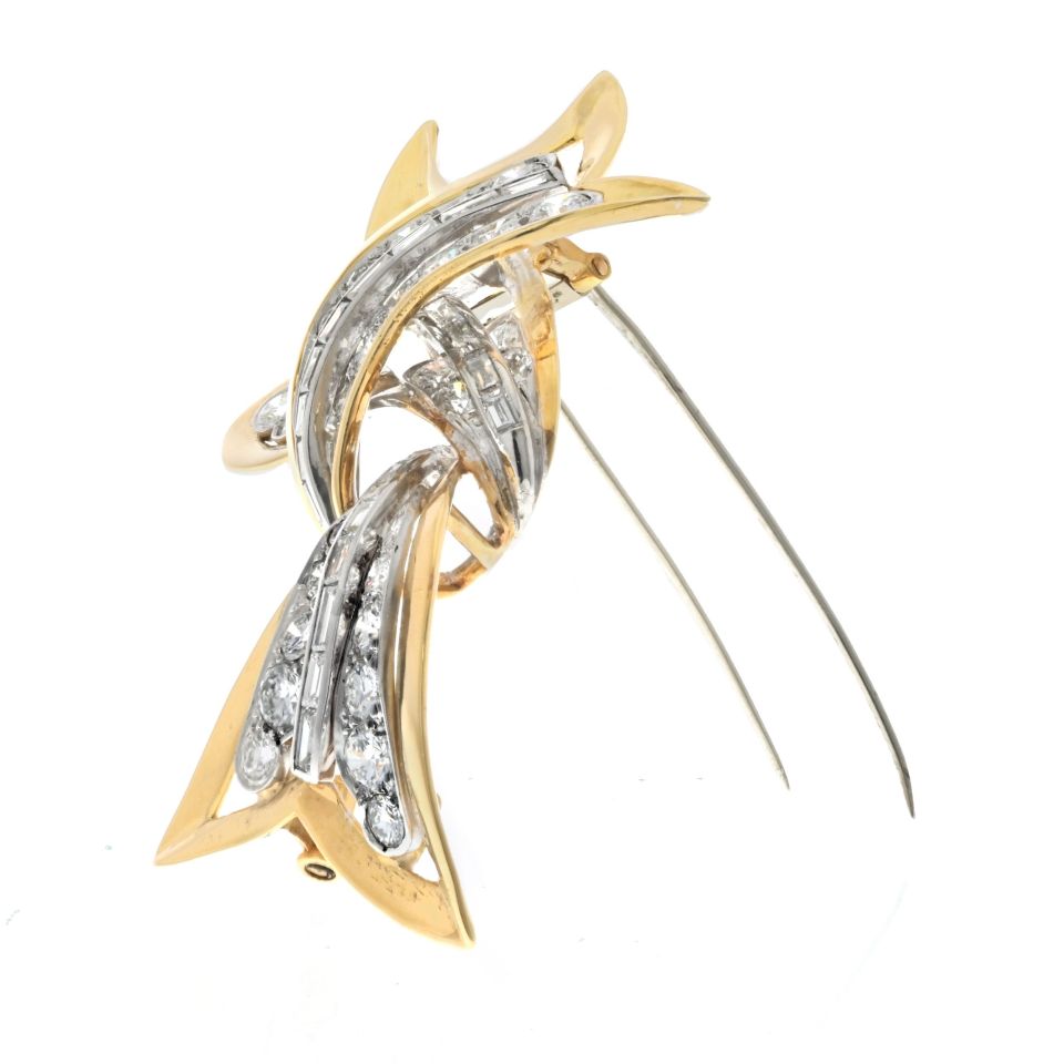 The brooch features an intricate ribbon design, expertly crafted to highlight the sparkling diamonds and the luxurious metals. The textured gold adds a rich, tactile quality, while the platinum provides a sleek and modern contrast, enhancing the overall brilliance of the diamonds.
