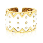 The David Webb "Rickrack" White Enamel Cuff is a true work of art. This exquisite cuff is crafted from 18k yellow gold and is 4cm wide. The white enamel applied all over it gives the piece a classic and elegant look. The round diamonds are expertly bezel set and are applied across the surface in free form, giving it a unique and artistic touch. With a carat weight of 2.82cts approximately, the diamonds add a brilliant sparkle that catches the eye. Weighing 153 grams, this cuff is substantial and luxurious. It is designed to fit a wrist size of 6 inches, making it a comfortable and secure fit.