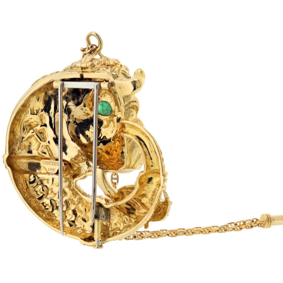 Crafted in 18-karat yellow gold, this intricate design features eyes accented with vibrant green emeralds, adding a touch of vivid color to the piece. Measuring 1-7/8 inches in diameter, this pin/pendant showcases the meticulous craftsmanship and attention to detail that David Webb is celebrated for.