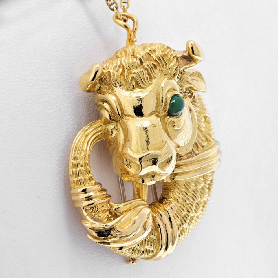 Introducing a bold and colorful pin/pendant crafted by David Webb in the 1970s, this stunning piece exemplifies Webb's renowned inspiration from the animal world. Presenting the Taurus pin/pendant, a remarkable creation that beautifully captures the essence of a bison.