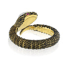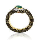 David Webb 18K yellow gold bracelet crafted in a form of a snake with a beautiful green cabochon emerald atop her head. Red ruby cabochon eyes and lovely round brilliant cut diamonds framing her head and tail add a touch of sparkle for an extra luxurious look.