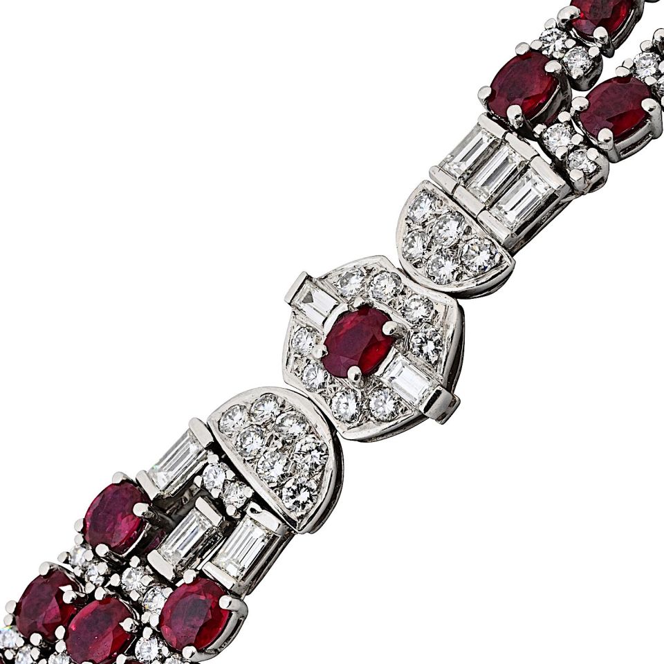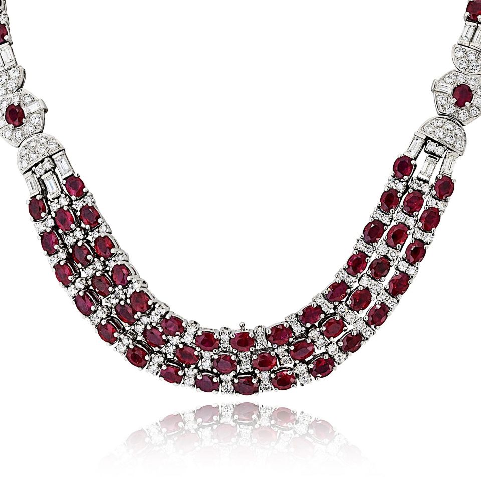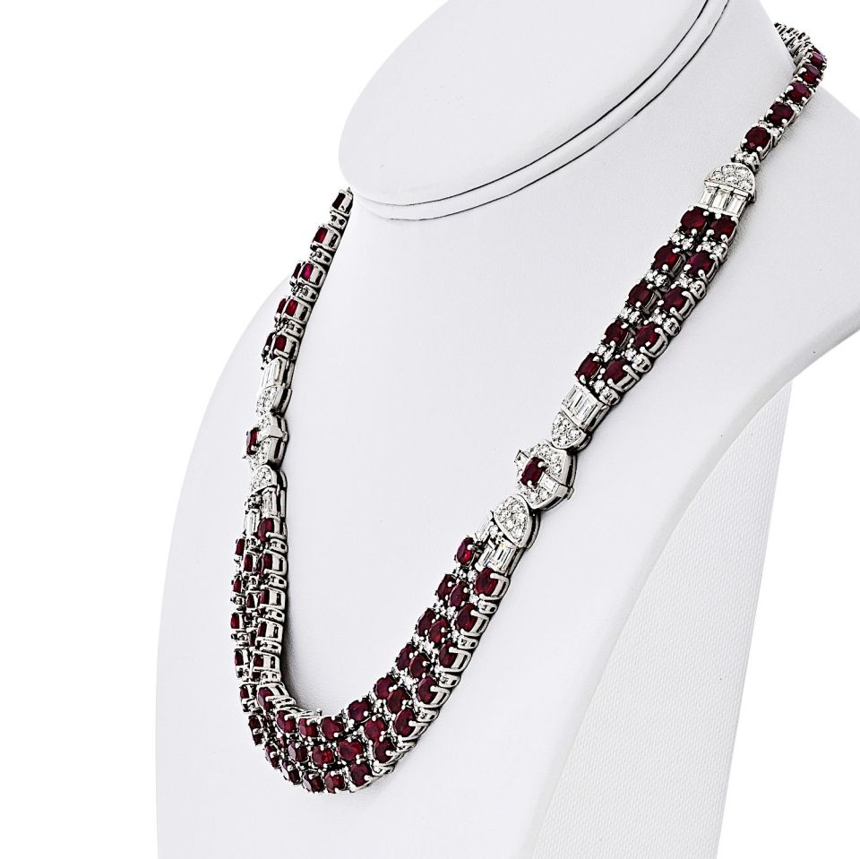 A magnificent platinum necklace designed in an Art Deco style, set with approximately 40.00 carats of fine Burmese rubies (heated), arranged in three graduating rows. Accented with brilliant and baguette-cut diamonds, weighing a total of approximately 8.40 carats, adding brilliance and contrast to the rich rubies. The piece showcases elegant geometric detailing characteristic of the Art Deco era.