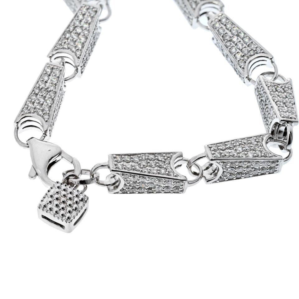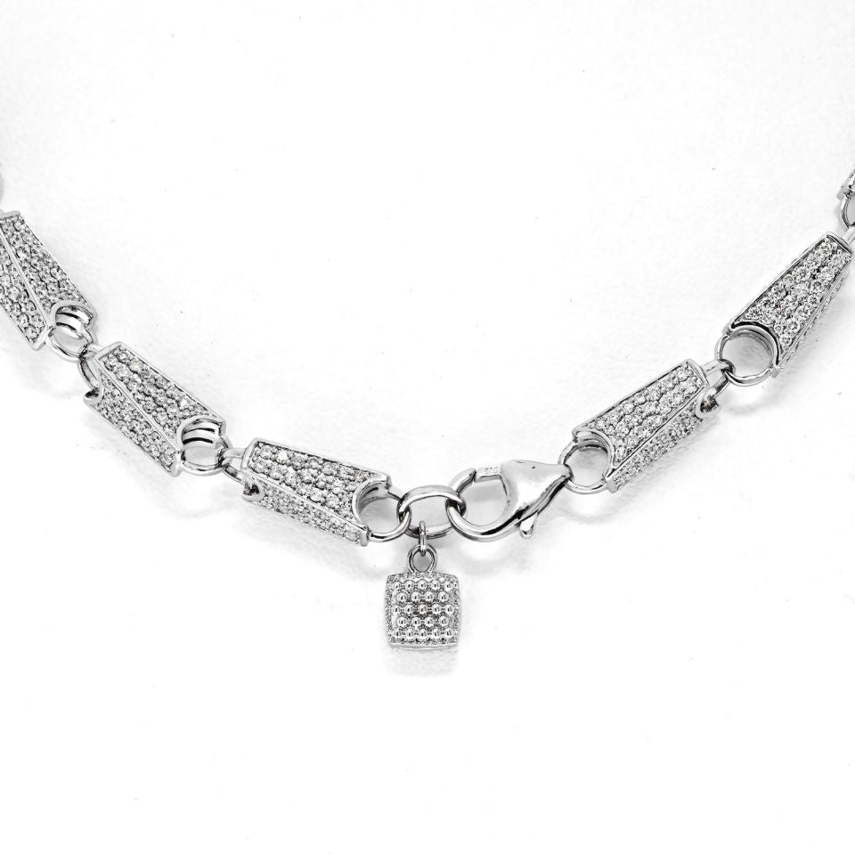 Contemporary diamond link chain necklace suitable for everyday wear as well as a special night out. It is fun and exciting to throw a diamond chain on over a white T-shirt or a white blouse. Best of all is when you wear this diamond necklace next to your other favorite chains creating a perfect neckmess. Diamonds are mounted on each link all the way around delivering continuous sparkle and shine.