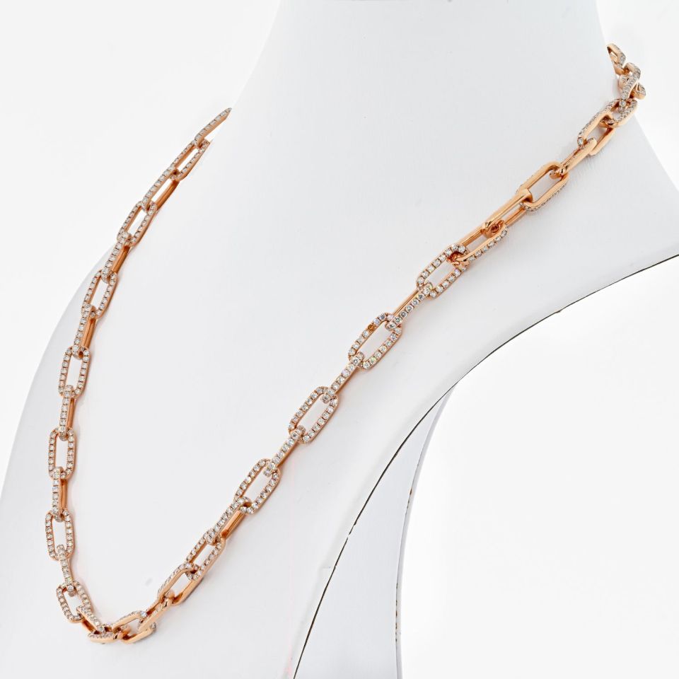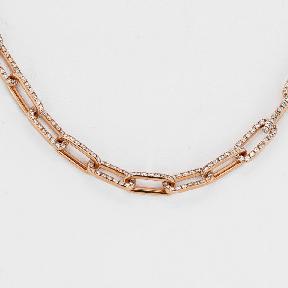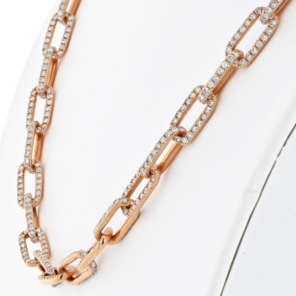 Crafted out of 18K rose gold, every paperclip link is accented with round-cut diamonds, total diamond weight is approximately 21 carats; length 22 inches; weight 58 g.
