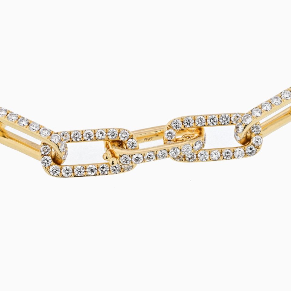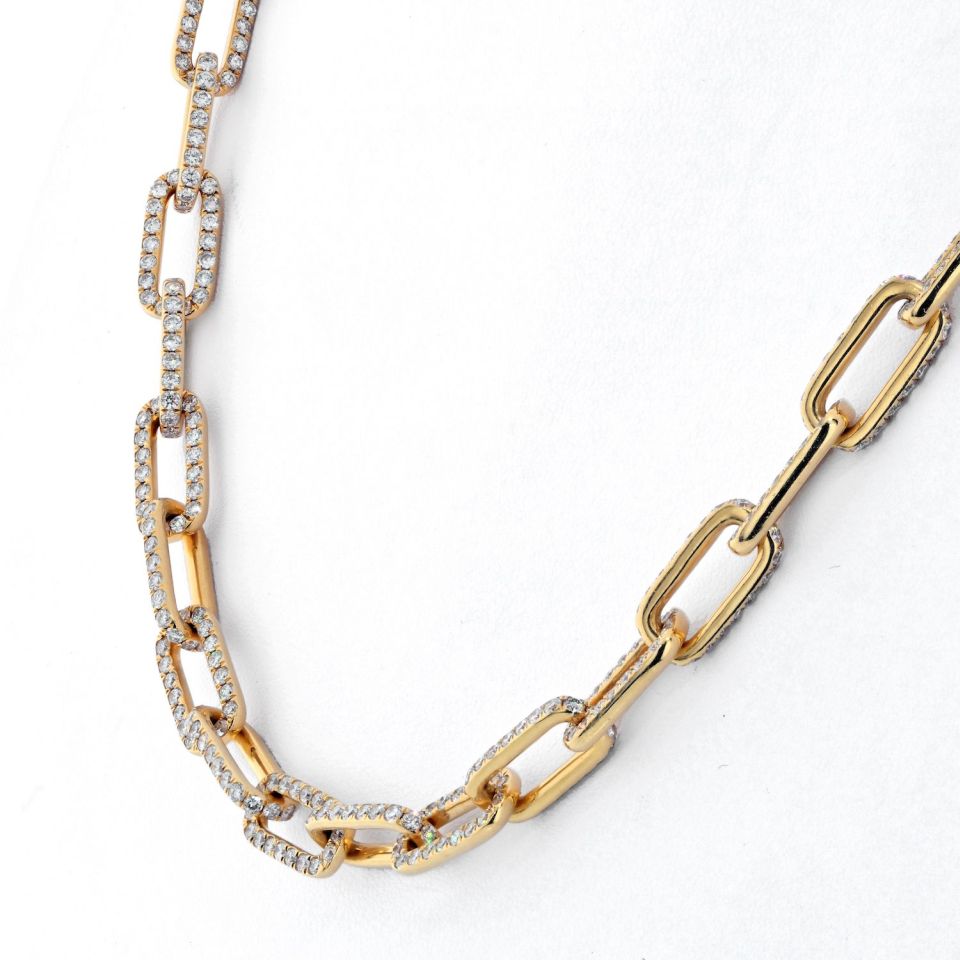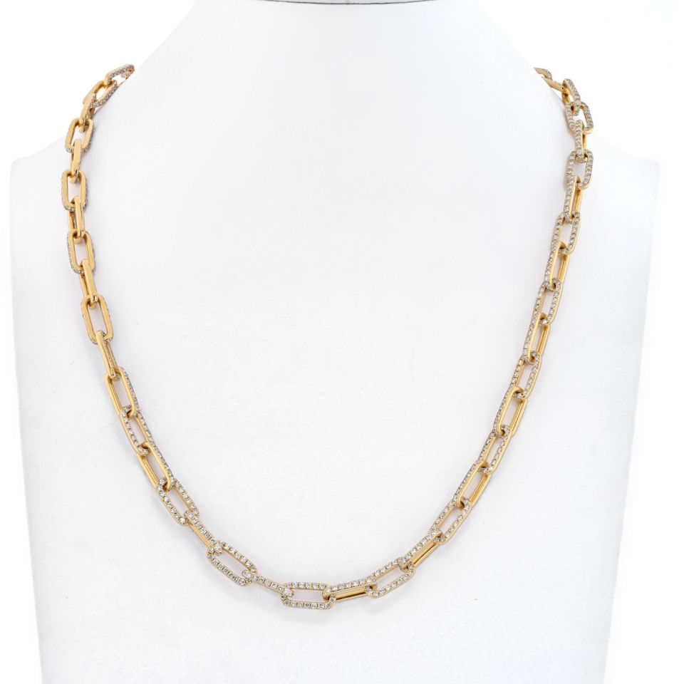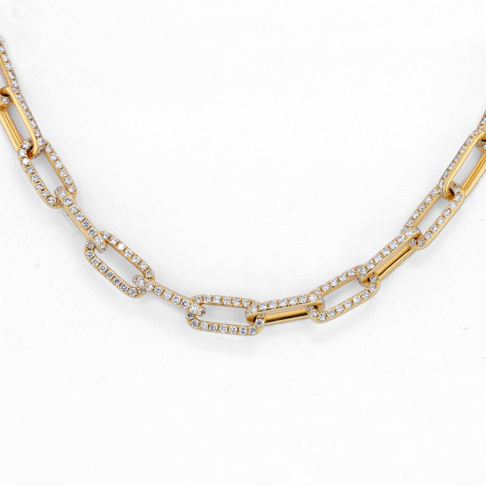 No your average paper clip diamond link chain necklace. Made in solid 18K Yellow Gold this chain diamond necklace is set with round cut diamonds on each link. Each station is solid and is about 2mm thick. 22 inches long this diamond chain offers a beatiful luxurious look and shine.