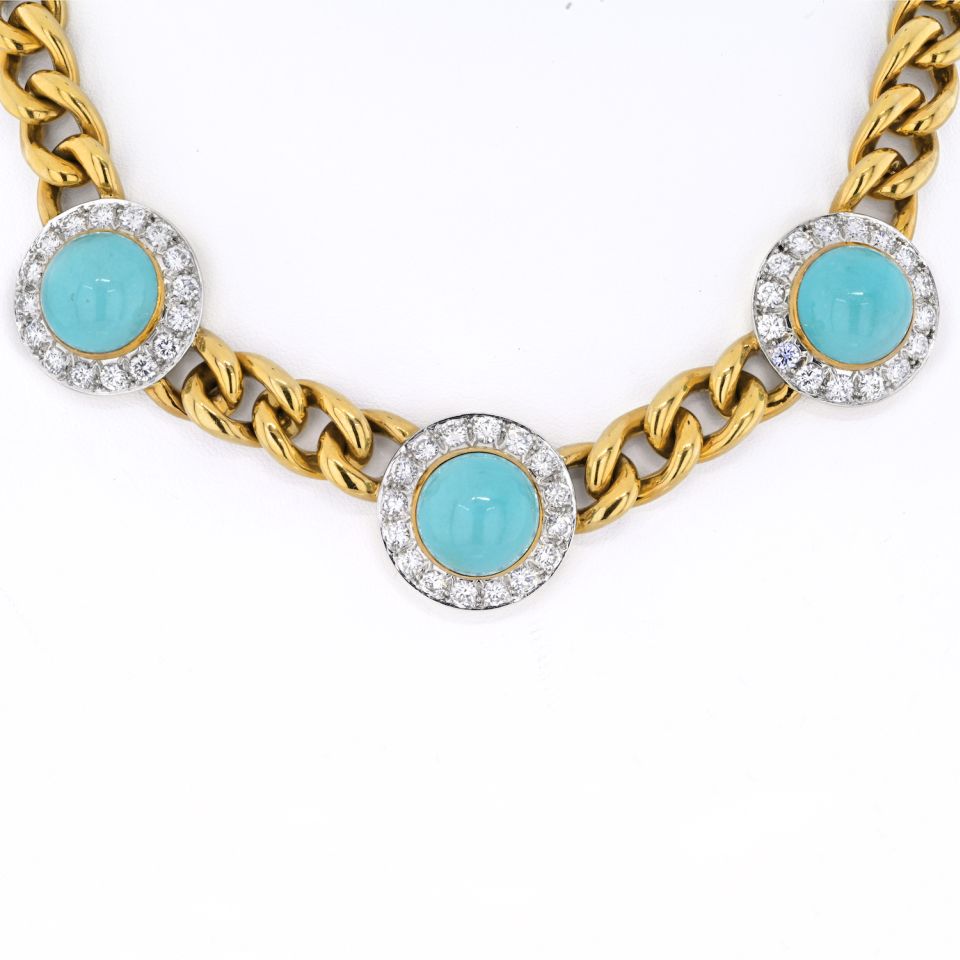 This is a lovely turquoise and diamond necklace made in 18k yellow gold. Featuring three cabochon turquoise stations each surrounded by round diamonds, completed by a curb link chain.