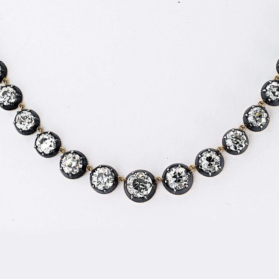 This exquisite handmade Victorian-style necklace is a true testament to timeless elegance. Crafted in 18K gold and silver, it features 50 stunning Old European cut diamonds, totaling an impressive 40.01 carats. Each diamond is GIA certified in I, J, K, and L color grades, ensuring authenticity and exceptional quality. Measuring 18 inches long, this necklace beautifully captures the romance and craftsmanship of the Victorian era, making it a breathtaking statement piece.