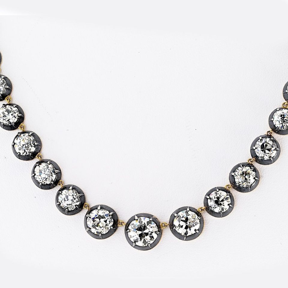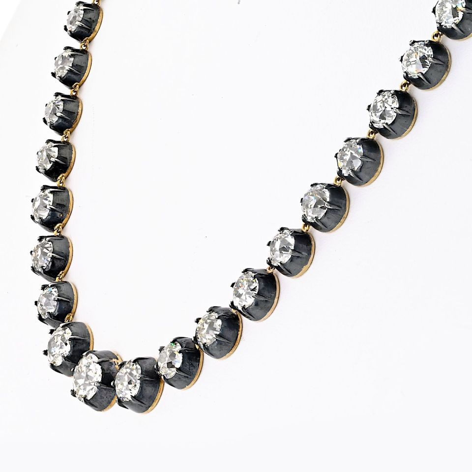 Inspired by the elegance of a bygone era, this antique-inspired necklace is a true masterpiece. Crafted in 18K yellow gold and silver, it showcases a breathtaking total of 46.15 carats of Old European cut diamonds. Featuring 53 exquisite diamonds, including six GIA-certified stones. This 19.5-inch necklace radiates timeless sophistication. A remarkable statement of luxury and heritage, it embodies the artistry of vintage craftsmanship.